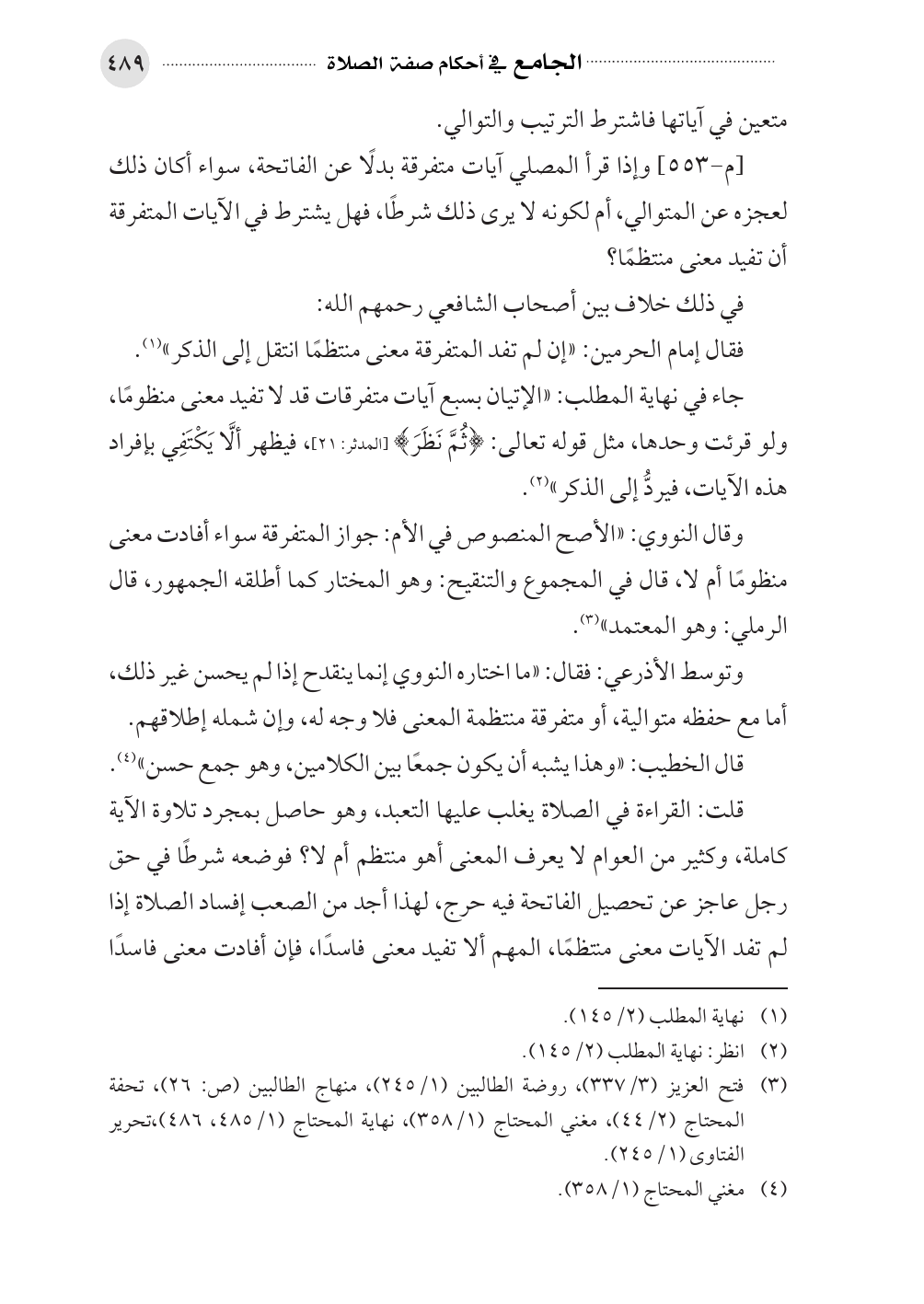 وقال النووي: «الأصح المنصوص في الأم: جواز المتفرقة سواء أفادت معنى منظومًا أم لا، قال في المجموع والتنقيح: وهو المختار كما أطلقه الجمهور، قال الرملي: وهو المعتمد» (¬٣).