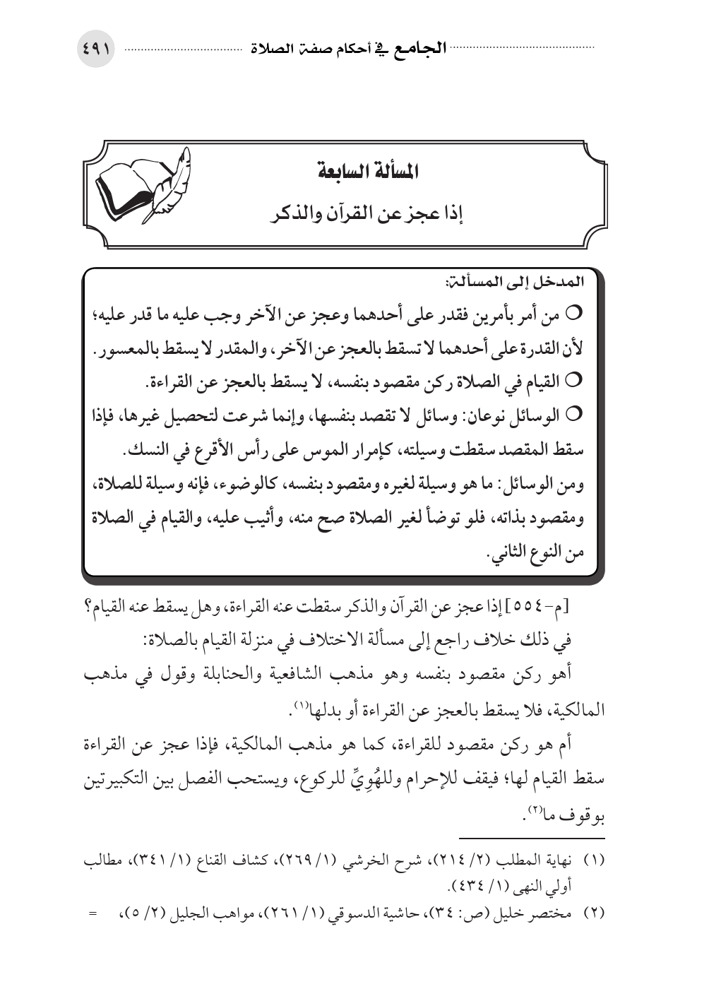 * القيام في الصلاة ركن مقصود بنفسه، لا يسقط بالعجز عن القراءة.