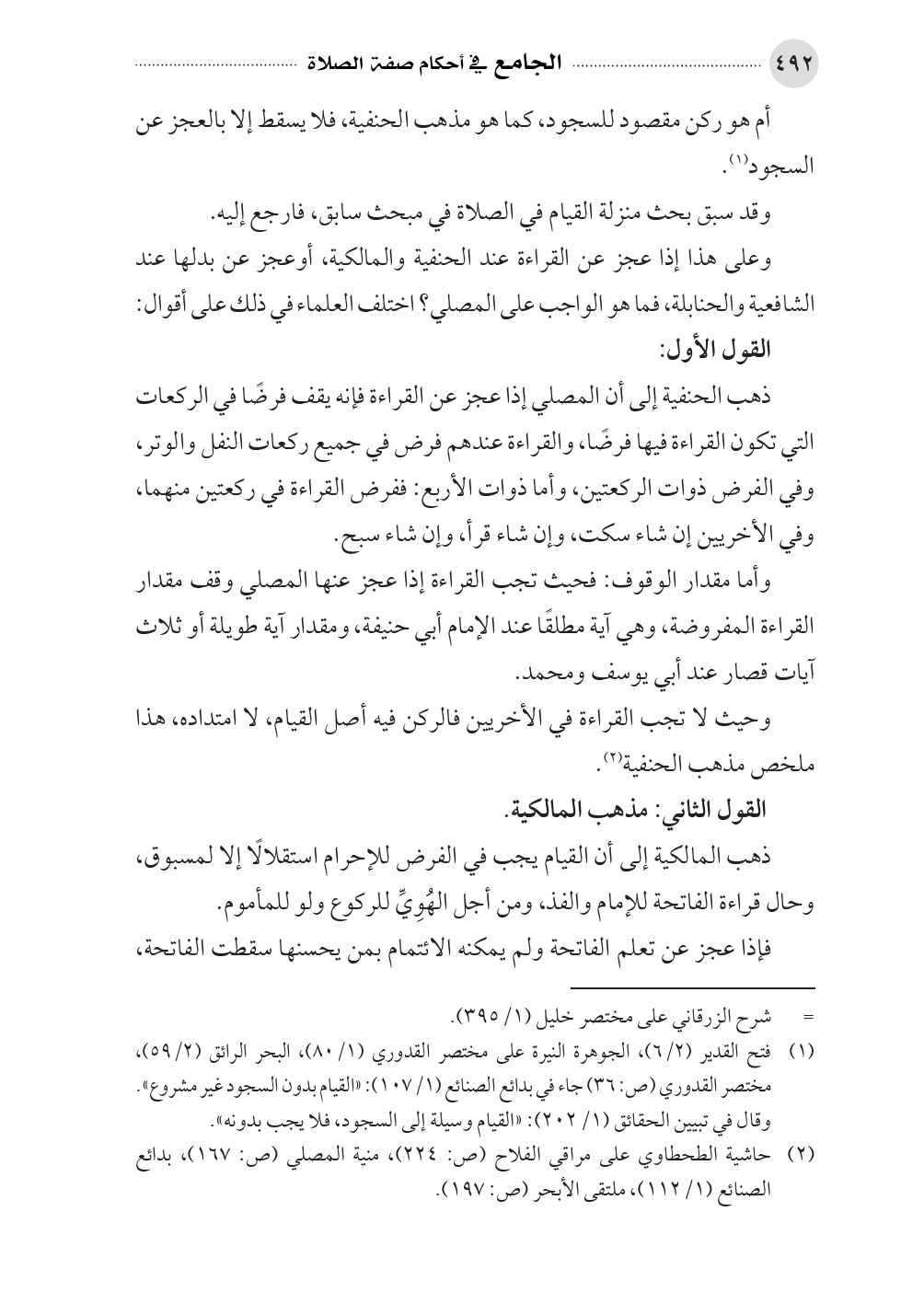 (¬١). فتح القدير (٢/ ٦)، الجوهرة النيرة على مختصر القدوري (١/ ٨٠)، البحر الرائق (٢/ ٥٩)، مختصر القدوري (ص: ٣٦) جاء في بدائع الصنائع (١/ ١٠٧): «القيام بدون السجود غير مشروع».