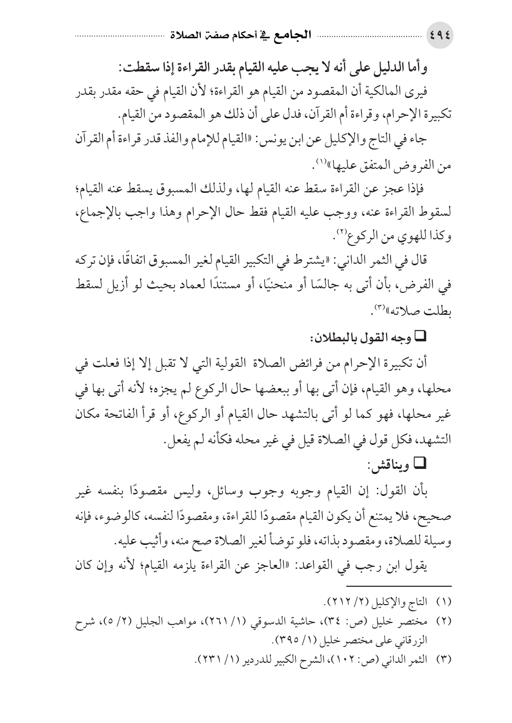 فإذا عجز عن القراءة سقط عنه القيام لها، ولذلك المسبوق يسقط عنه القيام؛ لسقوط القراءة عنه، ووجب عليه القيام فقط حال الإحرام وهذا واجب بالإجماع، وكذا للهوي من الركوع (¬٢).