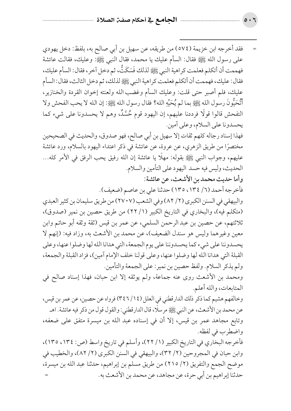 والبيهقي في السنن الكبرى (٢/ ٨٢) وفي الشعب (٢٧٠٧) من طريق سليمان بن كثير العبدي (متكلم فيه)، والبخاري في التاريخ الكبير (١/ ٢٢) من طريق حصين بن نمير (صدوق)، ثلاثتهم، عن حصين بن عبد الرحمن السلمي، عن عمر بن قيس (ثقة وثقه أبو حاتم وابن معين وغيرهما وليس هو سندل الضعيف)، عن محمد بن الأشعث به، وزاد فيه: (إنهم لا يحسدوننا على شيء كما يحسدوننا على يوم الجمعة، التي هدانا الله لها وضلوا عنها، وعلى القبلة التي هدانا الله لها وضلوا عنها، وعلى قولنا خلف الإمام آمين)، فزاد القبلة والجمعة، ولم يذكر السلام. ولفظ حصين بن نمير: على الجمعة والتأمين.