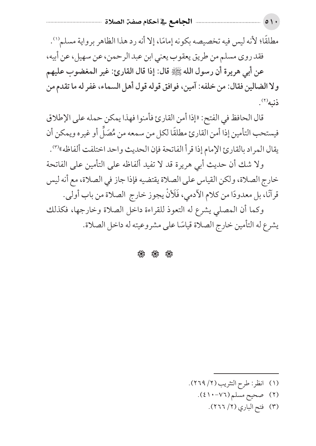 قال الحافظ في الفتح: «إذا أمن القارئ فأمنوا فهذا يمكن حمله على الإطلاق فيستحب التأمين إذا أمن القارئ مطلقًا لكل من سمعه من مُصَلٍّ أو غيره ويمكن أن يقال المراد بالقارئ الإمام إذا قرأ الفاتحة فإن الحديث واحد اختلفت ألفاظه» (¬٣).