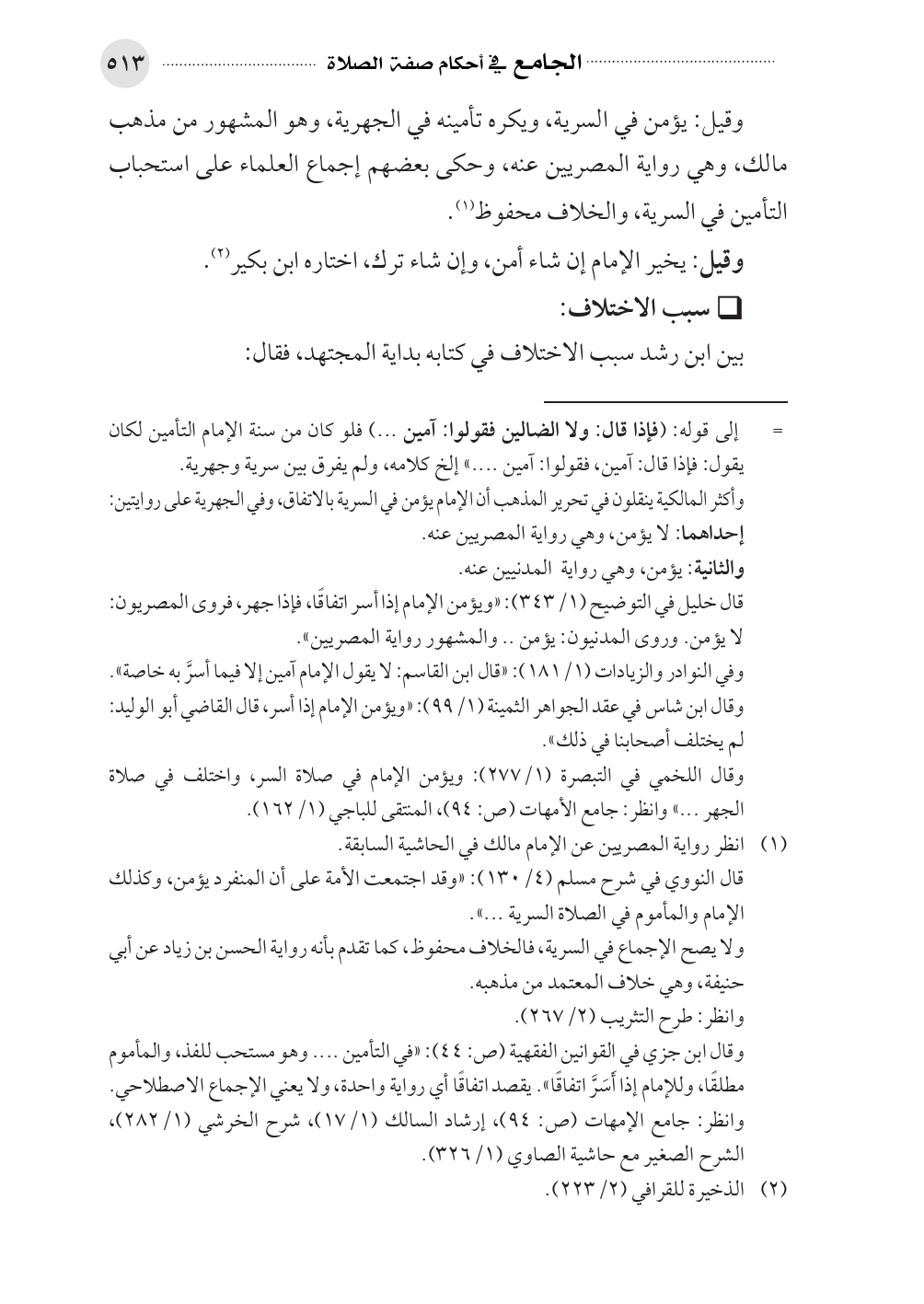 وقال اللخمي في التبصرة (١/ ٢٧٧): ويؤمن الإمام في صلاة السر، واختلف في صلاة الجهر ... » وانظر: جامع الأمهات (ص: ٩٤)، المنتقى للباجي (١/ ١٦٢).