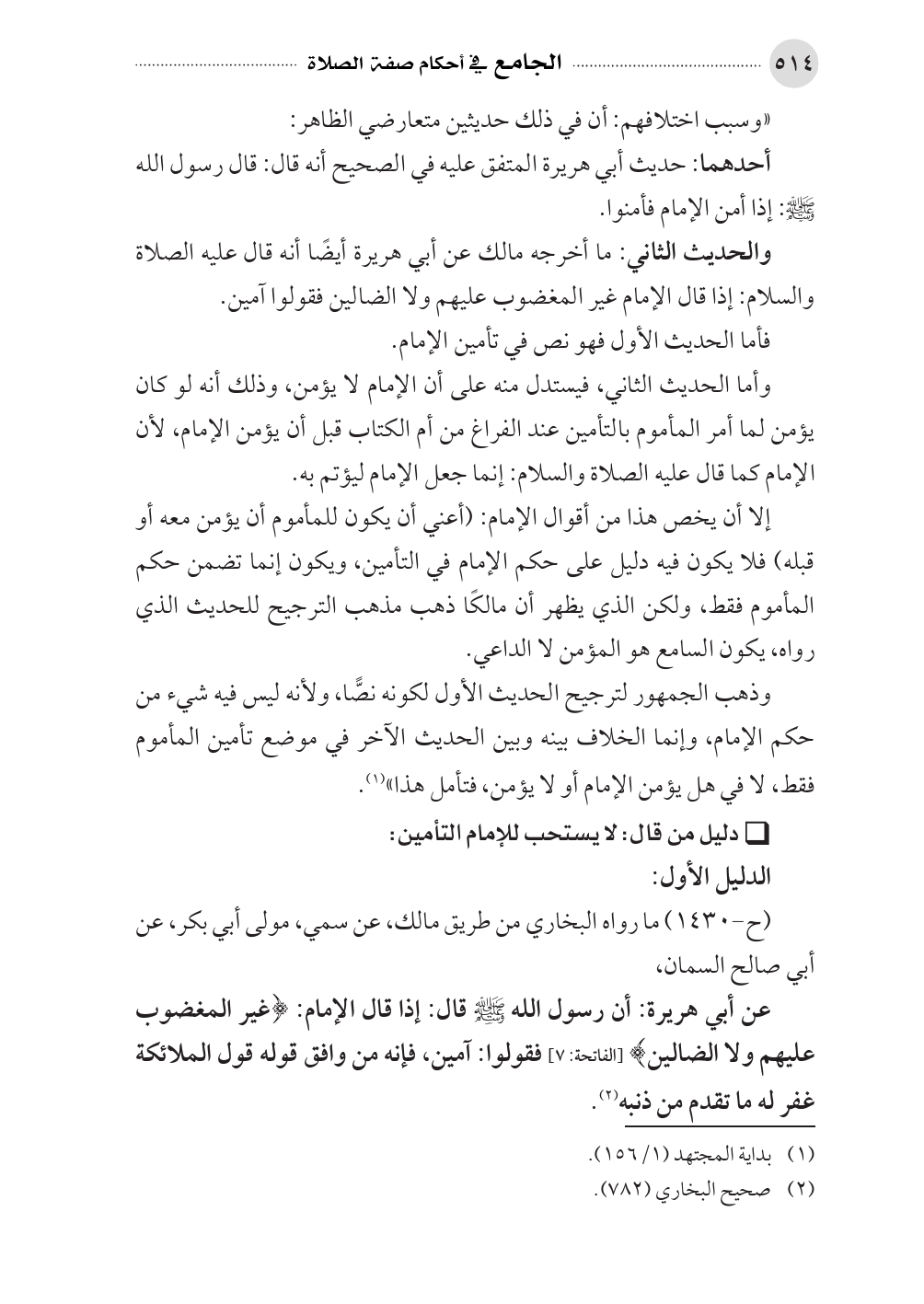 وذهب الجمهور لترجيح الحديث الأول لكونه نصًّا، ولأنه ليس فيه شيء من حكم الإمام، وإنما الخلاف بينه وبين الحديث الآخر في موضع تأمين المأموم فقط، لا في هل يؤمن الإمام أو لا يؤمن، فتأمل هذا» (¬١).