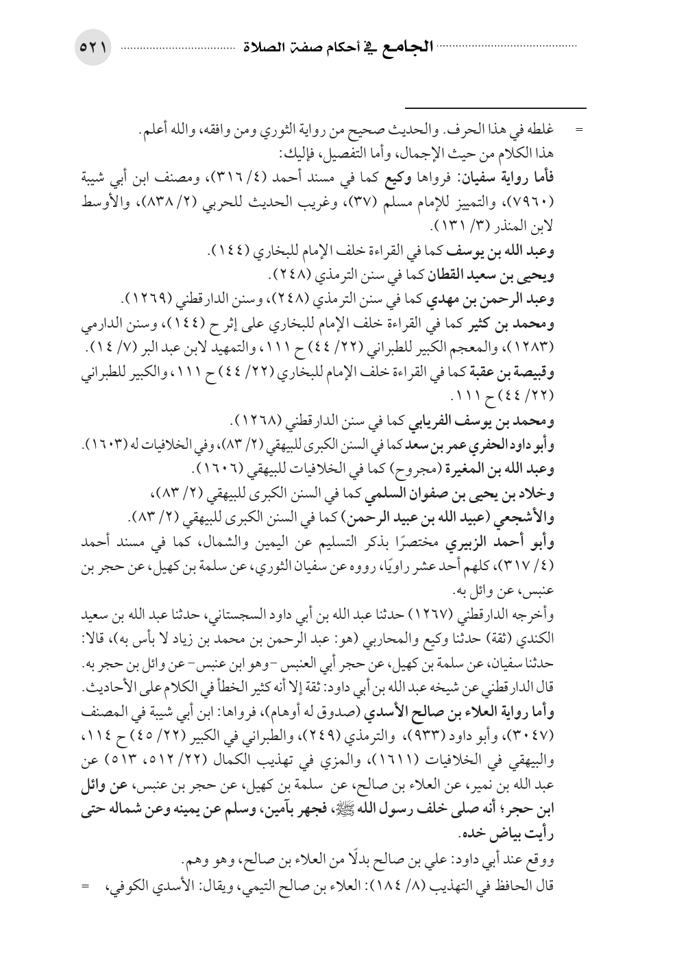 وأبو أحمد الزبيري مختصرًا بذكر التسليم عن اليمين والشمال، كما في مسند أحمد (٤/ ٣١٧)، كلهم أحد عشر راويًا، رووه عن سفيان الثوري، عن سلمة بن كهيل، عن حجر بن عنبس، عن وائل به.
