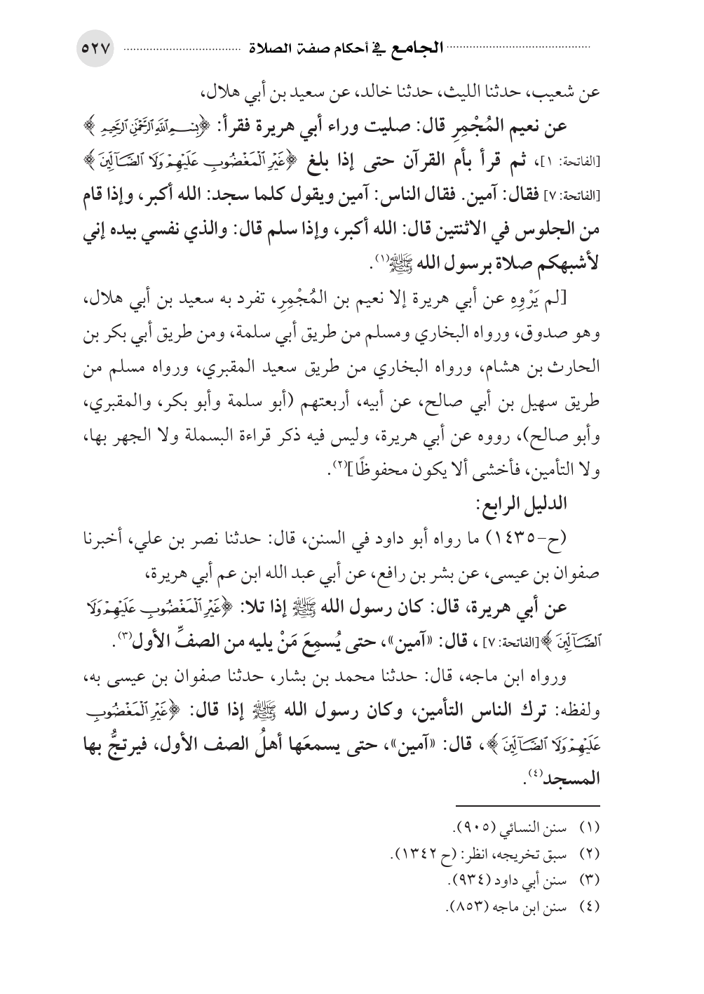 عن أبي هريرة، قال: كان رسول الله صلى الله عليه وسلم إذا تلا: {غَيرِ المَغضُوبِ عَلَيهِمْ وَلَا الضَّالِّين} [الفاتحة: ٧]، قال: «آمين»، حتى يُسمِعَ مَنْ يليه من الصفِّ الأول (¬٣).