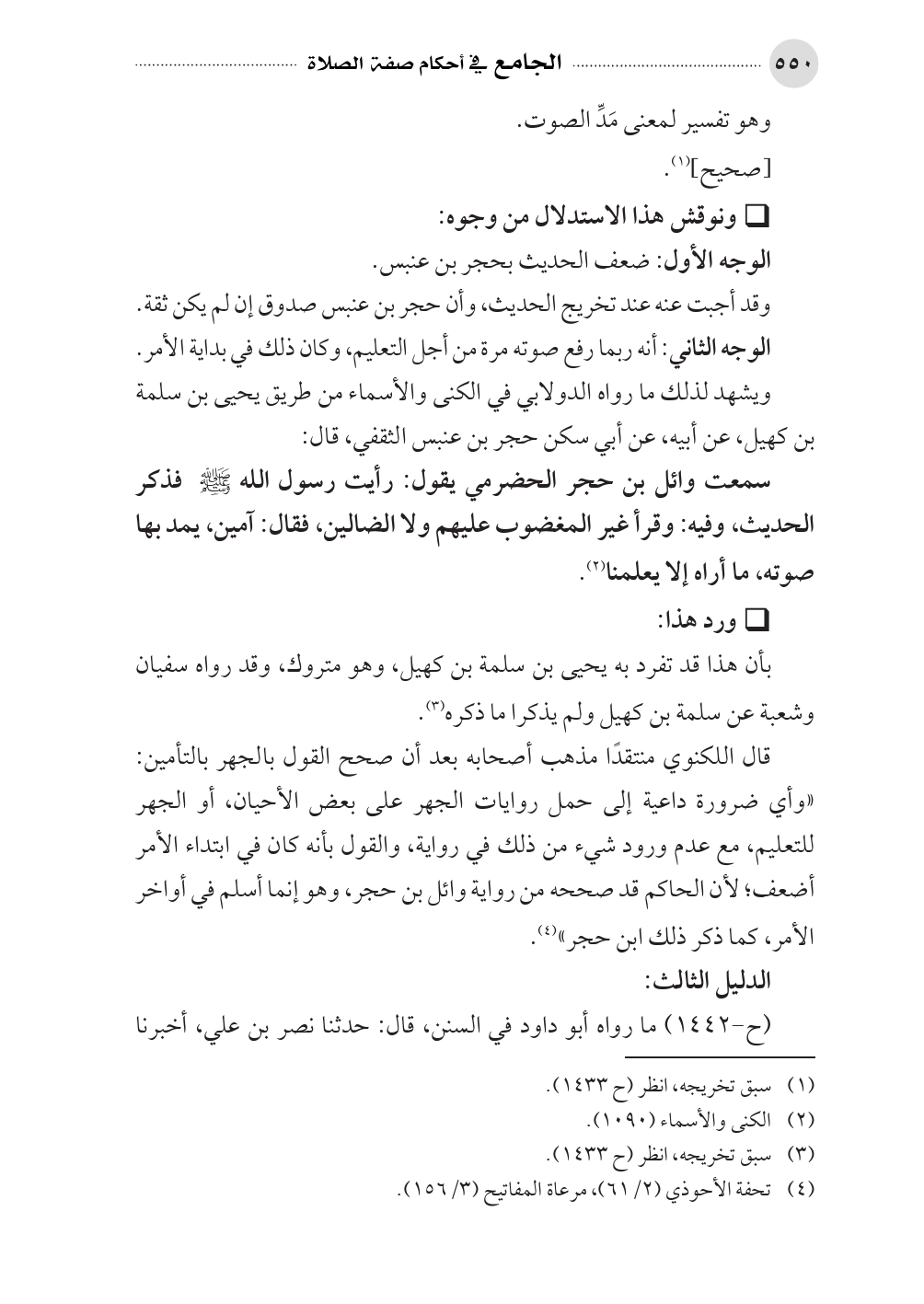 قال اللكنوي منتقدًا مذهب أصحابه بعد أن صحح القول بالجهر بالتأمين: «وأي ضرورة داعية إلى حمل روايات الجهر على بعض الأحيان، أو الجهر للتعليم، مع عدم ورود شيء من ذلك في رواية، والقول بأنه كان في ابتداء الأمر أضعف؛ لأن الحاكم قد صححه من رواية وائل بن حجر، وهو إنما أسلم في أواخر الأمر، كما ذكر ذلك ابن حجر» (¬٤).