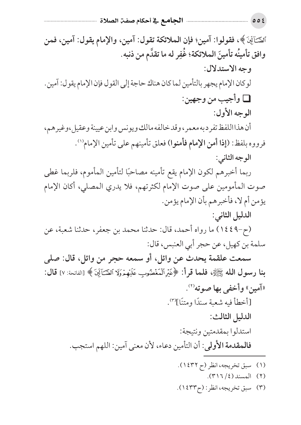 سمعت علقمة يحدث عن وائل، أو سمعه حجر من وائل، قال: صلى بنا رسول الله صلى الله عليه وسلم، فلما قرأ: {غَيرِ المَغضُوبِ عَلَيهِمْ وَلَا الضَّالِّين} [الفاتحة: ٧] قال: «آمين» وأخفى بها صوته (¬٢).