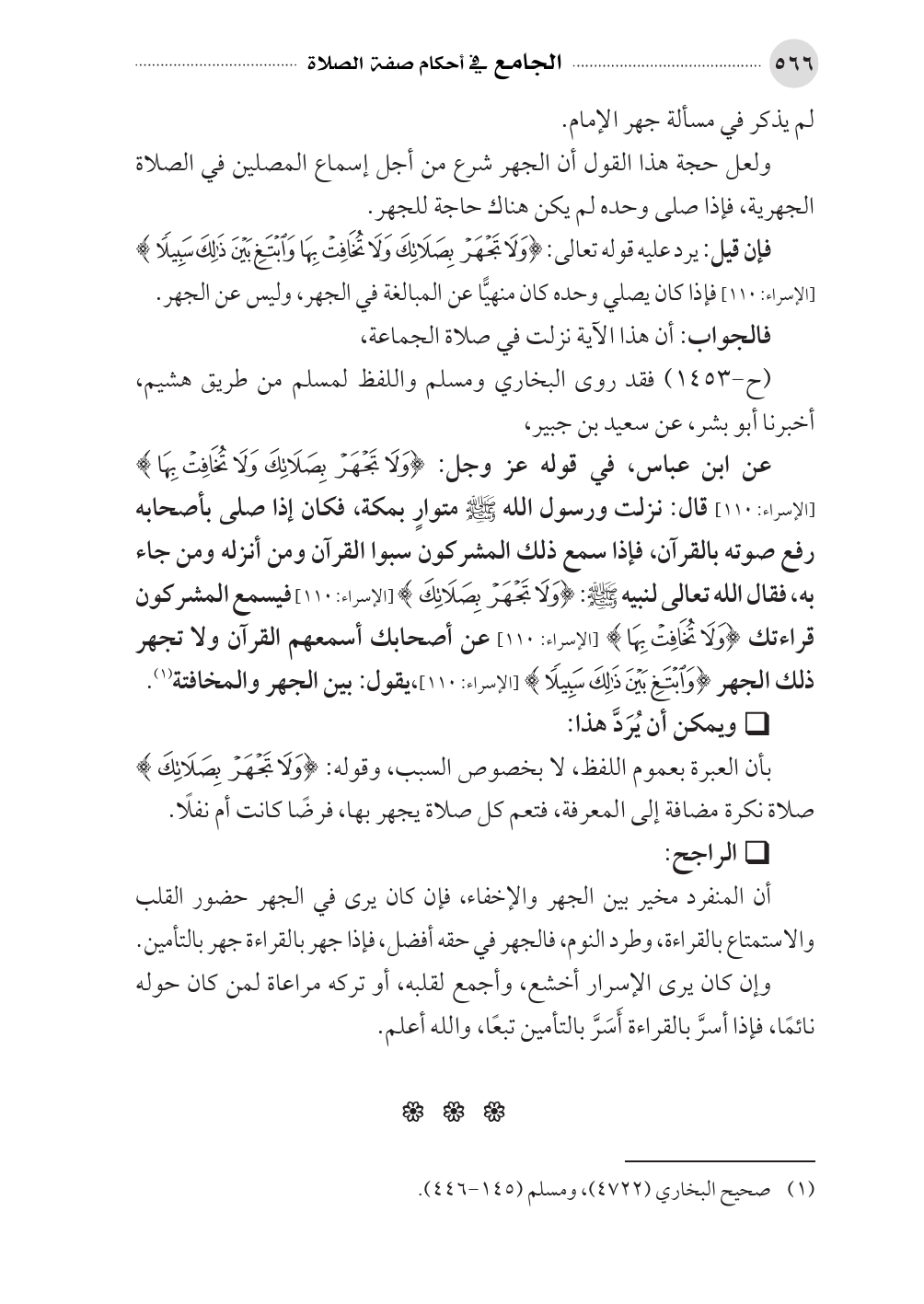 بأن العبرة بعموم اللفظ، لا بخصوص السبب، وقوله: {وَلَا تَجْهَرْ بِصَلَاتِكَ} صلاة نكرة مضافة إلى المعرفة، فتعم كل صلاة يجهر بها، فرضًا كانت أم نفلًا.