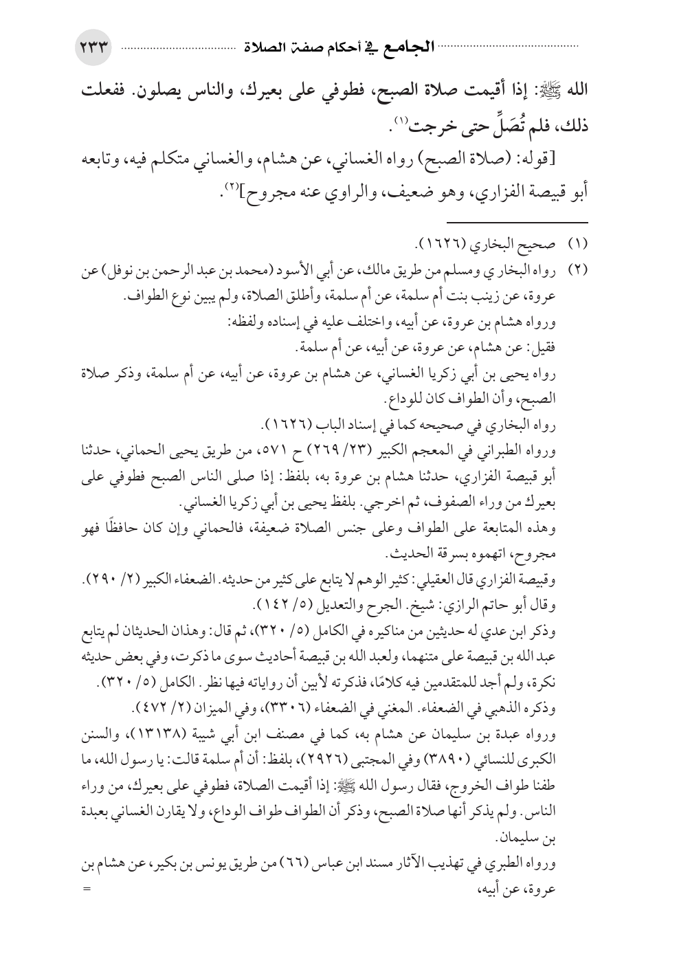 ورواه الطبراني في المعجم الكبير (٢٣/ ٢٦٩) ح ٥٧١، من طريق يحيى الحماني، حدثنا أبو قبيصة الفزاري، حدثنا هشام بن عروة به، بلفظ: إذا صلى الناس الصبح فطوفي على بعيرك من وراء الصفوف، ثم اخرجي. بلفظ يحيى بن أبي زكريا الغساني.