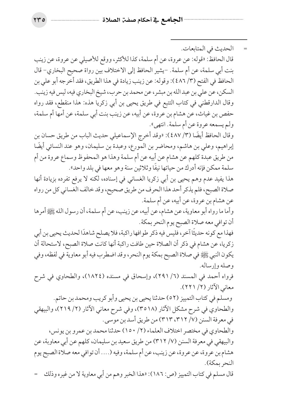 وأما ما رواه أبو معاوية، عن هشام، عن أبيه، عن زينب، عن أم سلمة، أن رسول الله - صلى الله عليه وسلم - أمرها أن توافي معه صلاة الصبح يوم النحر بمكة.