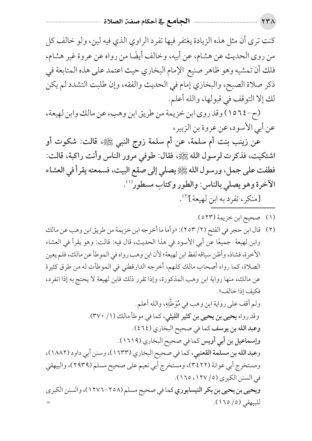 (¬٢). قال ابن حجر في الفتح (٢/ ٢٥٣): «وأما ما أخرجه ابن خزيمة من طريق ابن وهب عن مالك وابن لهيعة جميعًا عن أبي الأسود في هذا الحديث، قال فيه: قالت: وهو يقرأ في العشاء الأخرة، فشاذ، وأظن سياقه لفظ ابن لهيعة؛ لأن ابن وهب رواه في الموطأ عن مالك، فلم يعين الصلاة، كما رواه أصحاب مالك كلهم، أخرجه الدارقطني في الموطآت له من طرق كثيرة عن مالك، منها رواية ابن وهب المذكورة، وإذا تقرر ذلك فابن لهيعة لا يحتج به إذا انفرد، فكيف إذا خالف».