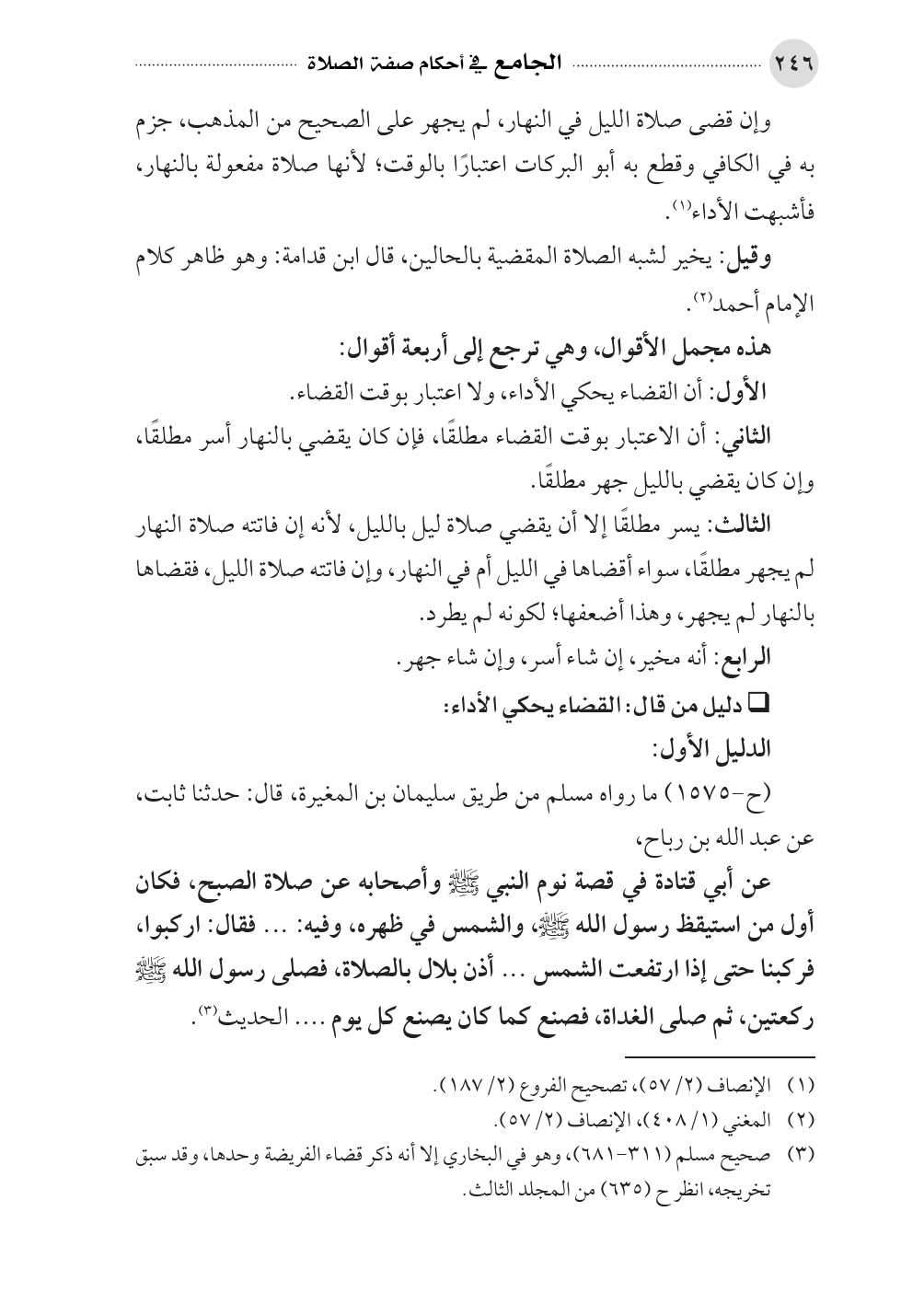 وقيل: يخير لشبه الصلاة المقضية بالحالين، قال ابن قدامة: وهو ظاهر كلام الإمام أحمد (¬٢).