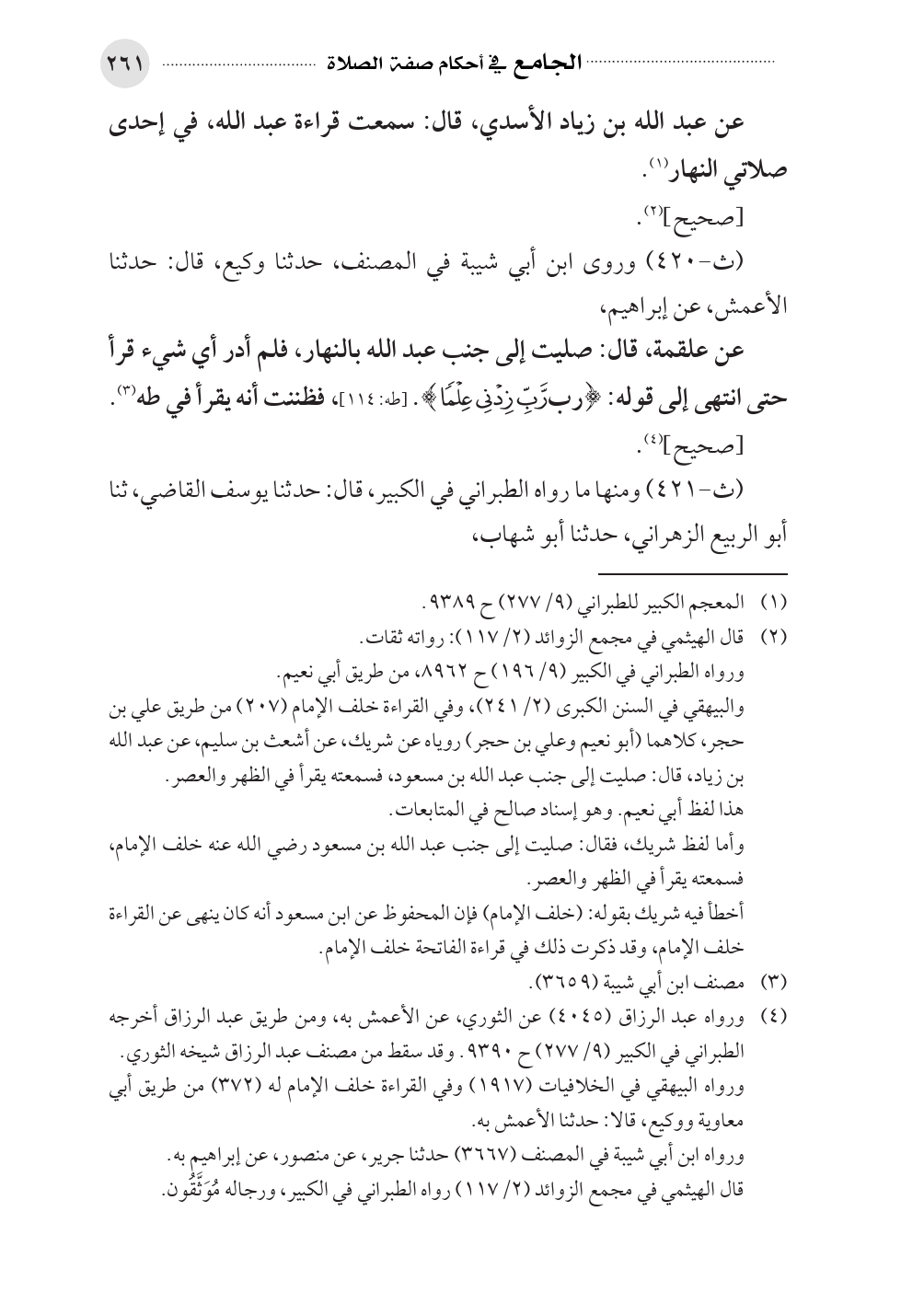 عن علقمة، قال: صليت إلى جنب عبد الله بالنهار، فلم أدر أي شيء قرأ حتى انتهى إلى قوله: {رَّبِّ زِدْنِي عِلْمًا}. [طه: ١١٤]، فظننت أنه يقرأ في طه (¬٣).