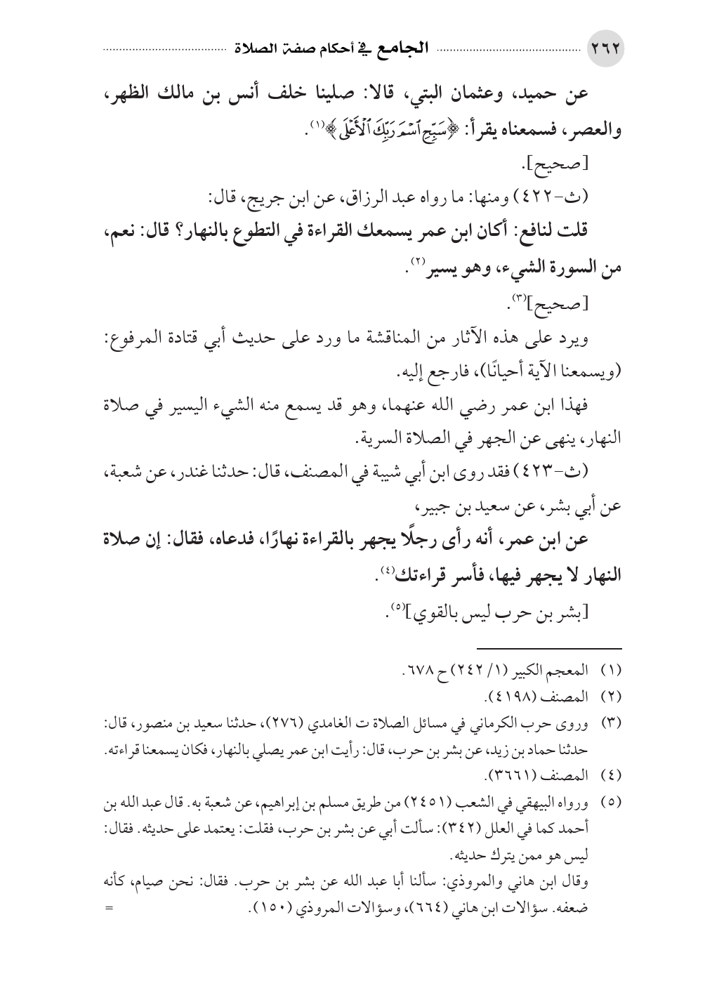 (¬٣). وروى حرب الكرماني في مسائل الصلاة ت الغامدي (٢٧٦)، حدثنا سعيد بن منصور، قال: حدثنا حماد بن زيد، عن بشر بن حرب، قال: رأيت ابن عمر يصلي بالنهار، فكان يسمعنا قراءته.