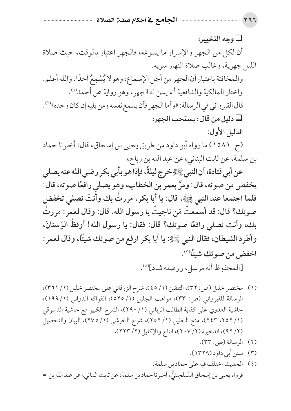 عن أبي قتادة؛ أن النبي - صلى الله عليه وسلم - خرج ليلةً، فإذا هو بأبي بكر رضي الله عنه يصلي يخفض من صوته، قال: ومرَّ بعمر بن الخطاب، وهو يصلي رافعًا صوته، قال: فلما اجتمعا عند النبي - صلى الله عليه وسلم -، قال: يا أبا بكر، مررتُ بك وأنتَ تصلي تخفض صوتك؟ قال: قد أسمعتُ مَن ناجيتُ يا رسول الله. قال: وقال لعمر: مررتُ بك، وأنت تصلي رافعًا صوتك؟ قال: فقال: يا رسول الله! أوقظُ الوَسنانَ، وأطرد الشيطان، فقال النبي - صلى الله عليه وسلم -: يا أبا بكر ارفع من صوتك شيئًا، وقال لعمر: اخفض من صوتك شيئًا (¬٣).