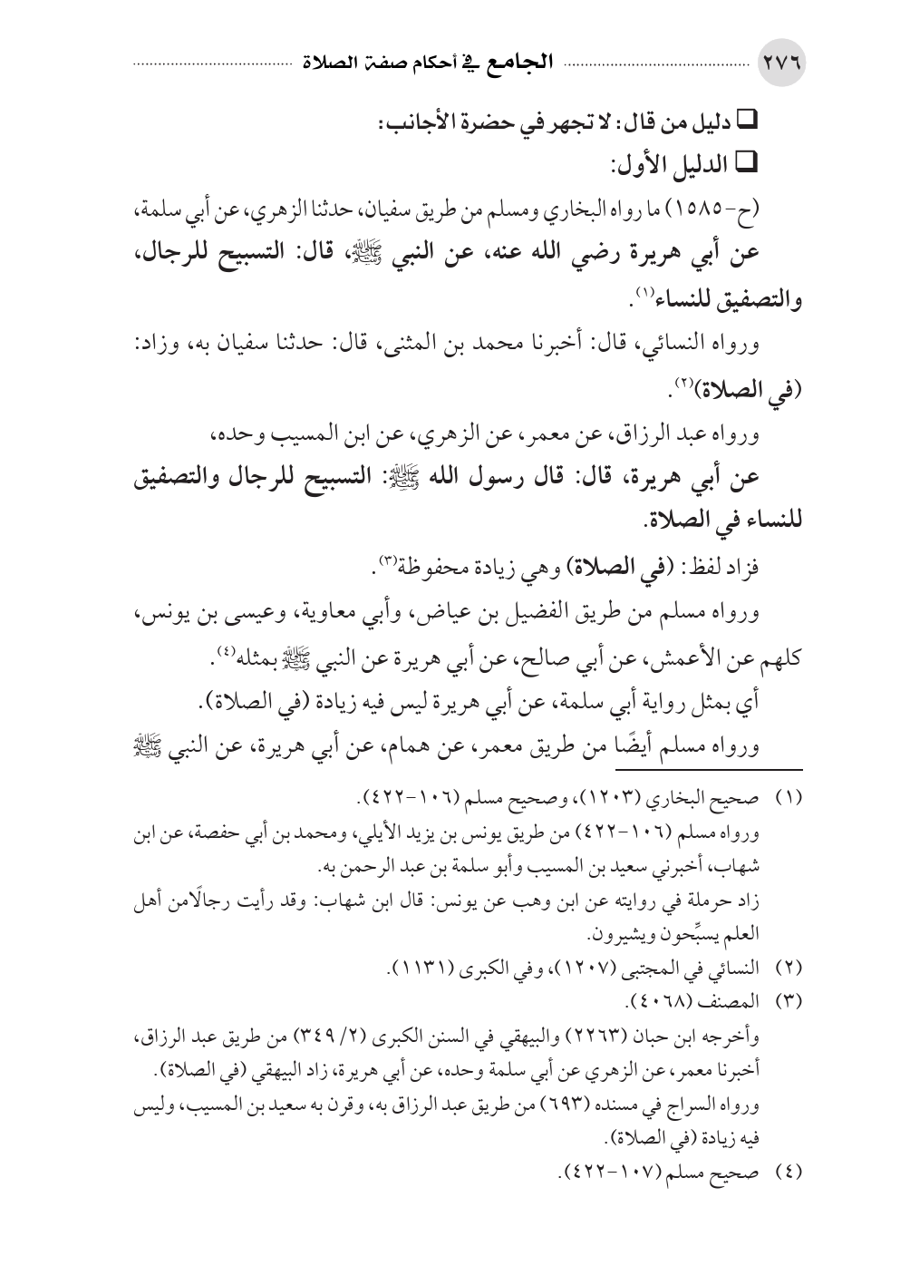 عن أبي هريرة رضي الله عنه، عن النبي - صلى الله عليه وسلم -، قال: التسبيح للرجال، والتصفيق للنساء (¬١).
