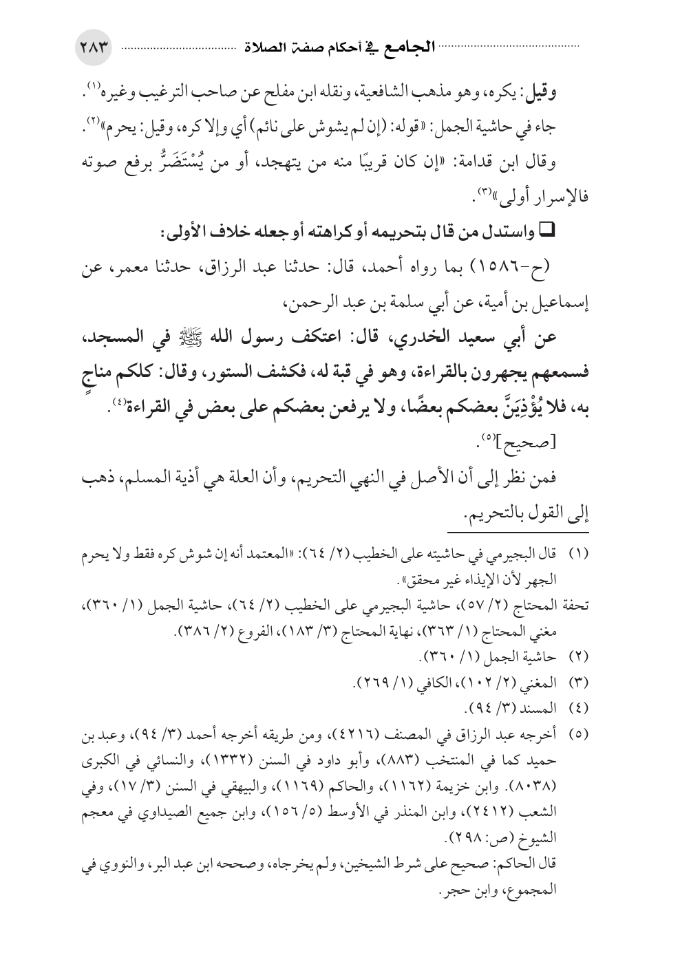 (¬١). قال البجيرمي في حاشيته على الخطيب (٢/ ٦٤): «المعتمد أنه إن شوش كره فقط ولا يحرم الجهر لأن الإيذاء غير محقق».