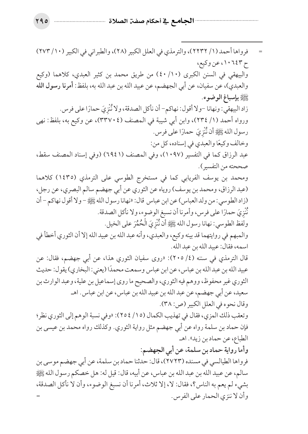 ومحمد بن يوسف الفريابي كما في مستخرج الطوسي على الترمذي (١٤٣٥) كلاهما (عبد الرزاق، ومحمد بن يوسف) روياه عن الثوري عن أبي جهضم سالم البصري، عن رجل، (زاد الطوسي: من ولد العباس) عن ابن عباس قال: «نهانا رسول الله - صلى الله عليه وسلم - ولا أقول نهاكم - أن نُنْزِيَ حمارًا على فرس، وأمرنا أن نسبغ الوضوء، ولا نأكل الصدقة.