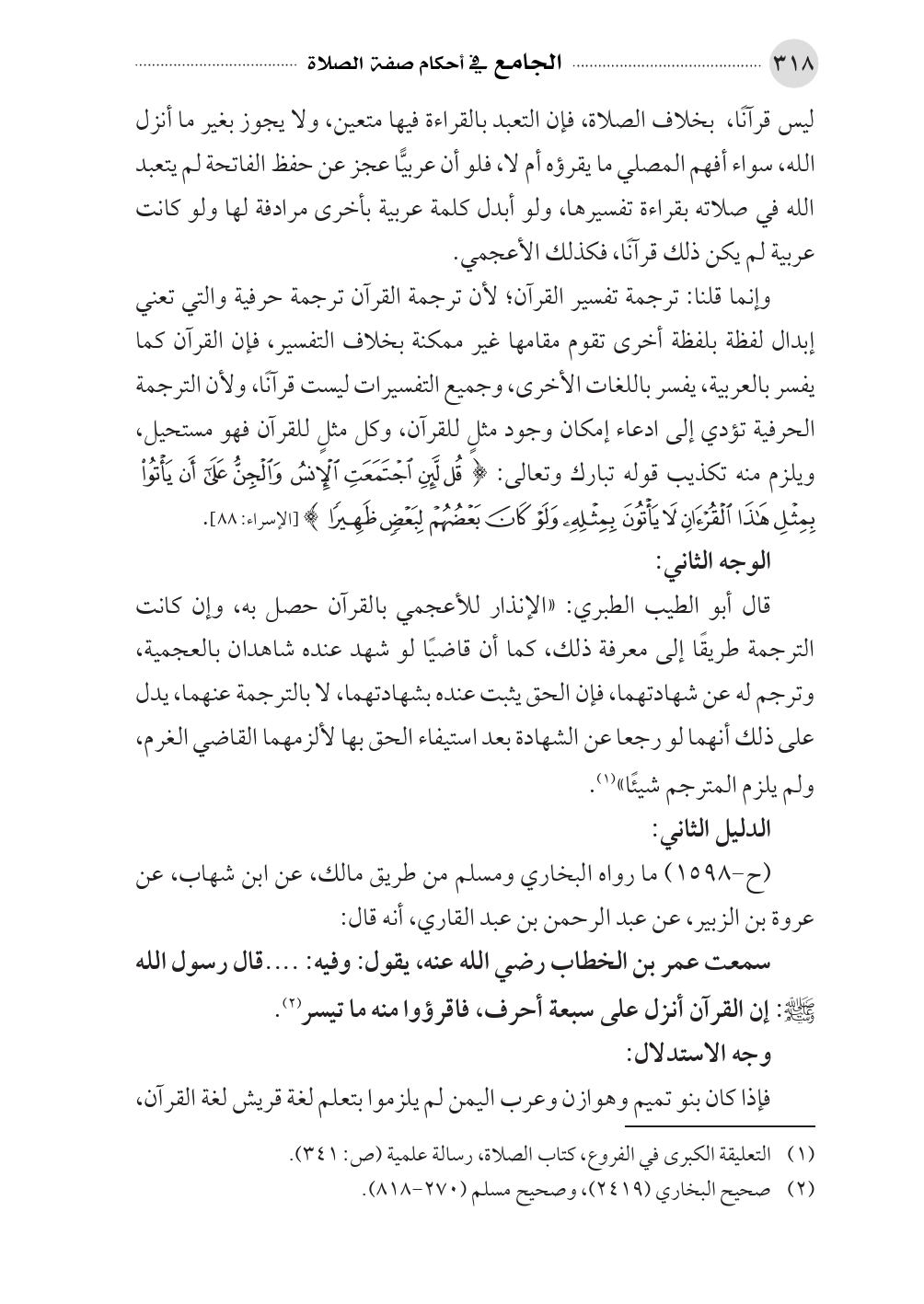 وإنما قلنا: ترجمة تفسير القرآن؛ لأن ترجمة القرآن ترجمة حرفية والتي تعني إبدال لفظة بلفظة أخرى تقوم مقامها غير ممكنة بخلاف التفسير، فإن القرآن كما يفسر بالعربية، يفسر باللغات الأخرى، وجميع التفسيرات ليست قرآنًا، ولأن الترجمة الحرفية تؤدي إلى ادعاء إمكان وجود مثلٍ للقرآن، وكل مثلٍ للقرآن فهو مستحيل، ويلزم منه تكذيب قوله تبارك وتعالى: {قُل لَّئِنِ اجْتَمَعَتِ الإِنسُ وَالْجِنُّ عَلَى أَن يَأْتُوا بِمِثْلِ هَذَا الْقُرْآنِ لَا يَأْتُونَ بِمِثْلِهِ وَلَوْ كَانَ بَعْضُهُمْ لِبَعْضٍ ظَهِيرًا} [الإسراء: ٨٨].