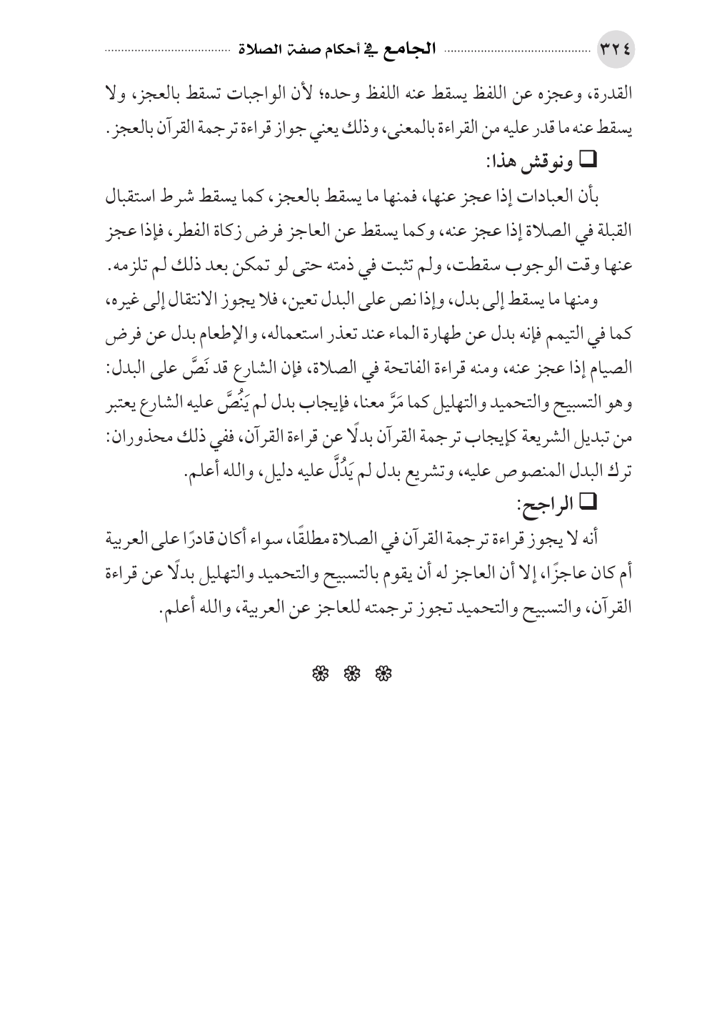 القدرة، وعجزه عن اللفظ يسقط عنه اللفظ وحده؛ لأن الواجبات تسقط بالعجز، ولا يسقط عنه ما قدر عليه من القراءة بالمعنى، وذلك يعني جواز قراءة ترجمة القرآن بالعجز.