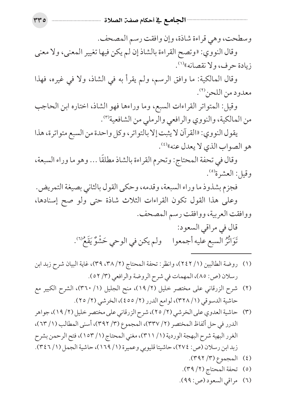وقال النووي: «وتصح القراءة بالشاذ إن لم يكن فيها تغيير المعنى، ولا معنى زيادة حرف، ولا نقصانه» (¬١).