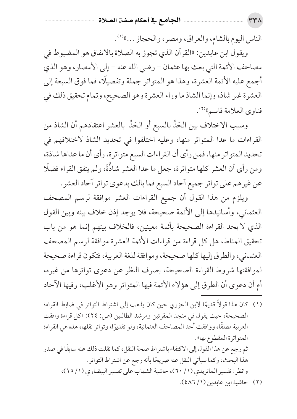 ويقول ابن عابدين: «القرآن الذي تجوز به الصلاة بالاتفاق هو المضبوط في مصاحف الأئمة التي بعث بها عثمان - رضي الله عنه - إلى الأمصار، وهو الذي أجمع عليه الأئمة العشرة، وهذا هو المتواتر جملة وتفصيلًا، فما فوق السبعة إلى العشرة غير شاذ، وإنما الشاذ ما وراء العشرة وهو الصحيح، وتمام تحقيق ذلك في فتاوى العلامة قاسم» (¬٢).