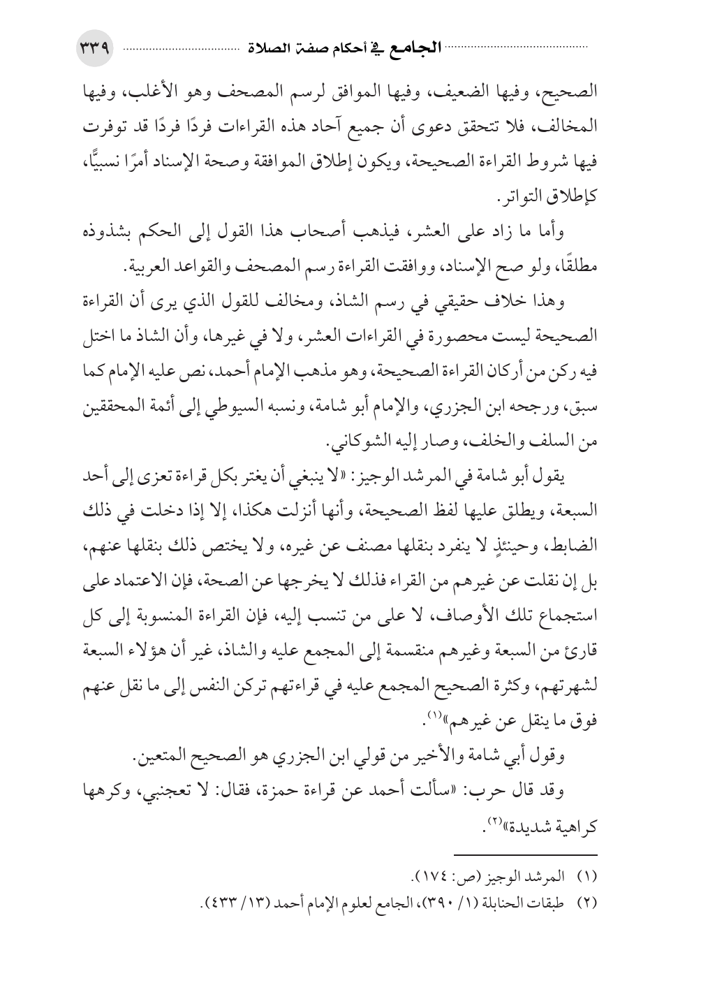 وقول أبي شامة والأخير من قولي ابن الجزري هو الصحيح المتعين.