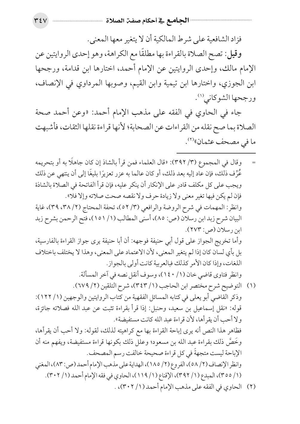 جاء في الحاوي في الفقه على مذهب الإمام أحمد: «وعن أحمد صحة الصلاة بما صح نقله من القراءات عن الصحابة؛ لأنها قراءة نقلها الثقات، فأشبهت ما في مصحف عثمان» (¬٢).