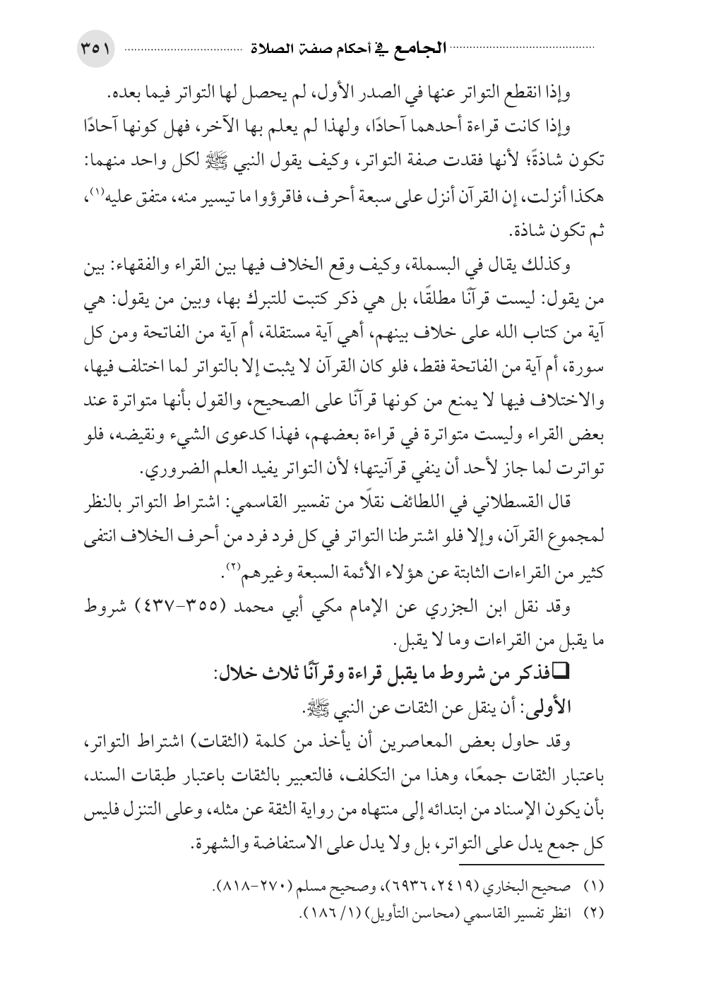وكذلك يقال في البسملة، وكيف وقع الخلاف فيها بين القراء والفقهاء: بين من يقول: ليست قرآنًا مطلقًا، بل هي ذكر كتبت للتبرك بها، وبين من يقول: هي آية من كتاب الله على خلاف بينهم، أهي آية مستقلة، أم آية من الفاتحة ومن كل سورة، أم آية من الفاتحة فقط، فلو كان القرآن لا يثبت إلا بالتواتر لما اختلف فيها، والاختلاف فيها لا يمنع من كونها قرآنًا على الصحيح، والقول بأنها متواترة عند بعض القراء وليست متواترة في قراءة بعضهم، فهذا كدعوى الشيء ونقيضه، فلو تواترت لما جاز لأحد أن ينفي قرآنيتها؛ لأن التواتر يفيد العلم الضروري.