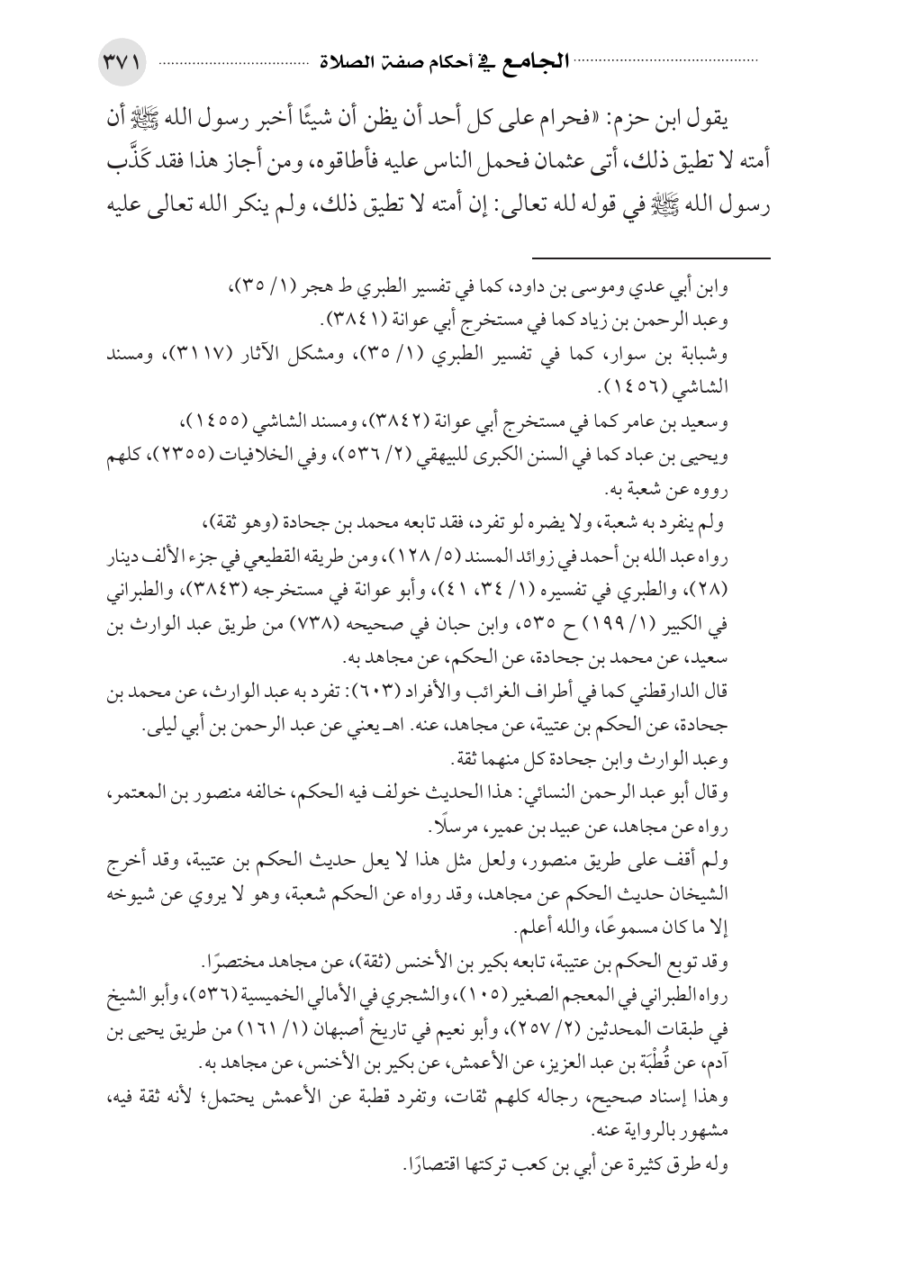 يقول ابن حزم: «فحرام على كل أحد أن يظن أن شيئًا أخبر رسول الله - صلى الله عليه وسلم - أن أمته لا تطيق ذلك، أتى عثمان فحمل الناس عليه فأطاقوه، ومن أجاز هذا فقد كَذَّب رسول الله - صلى الله عليه وسلم - في قوله لله تعالى: إن أمته لا تطيق ذلك، ولم ينكر الله تعالى عليه