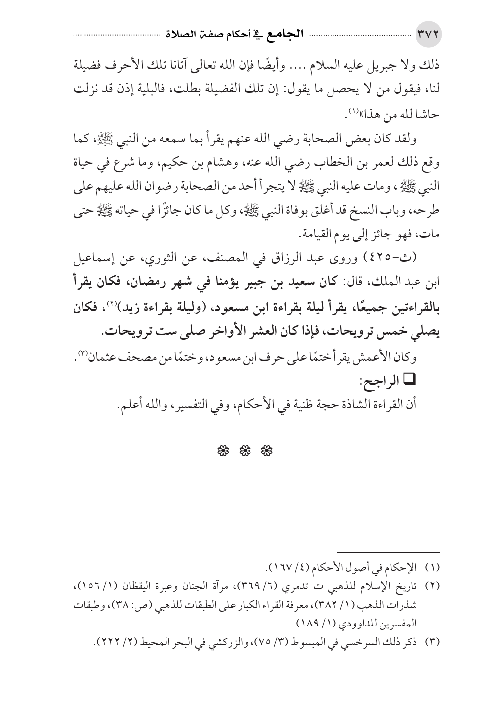 ولقد كان بعض الصحابة رضي الله عنهم يقرأ بما سمعه من النبي - صلى الله عليه وسلم -، كما وقع ذلك لعمر بن الخطاب رضي الله عنه، وهشام بن حكيم، وما شرع في حياة النبي - صلى الله عليه وسلم -، ومات عليه النبي - صلى الله عليه وسلم - لا يتجرأ أحد من الصحابة رضوان الله عليهم على طرحه، وباب النسخ قد أغلق بوفاة النبي - صلى الله عليه وسلم -، وكل ما كان جائزًا في حياته - صلى الله عليه وسلم - حتى مات، فهو جائز إلى يوم القيامة.