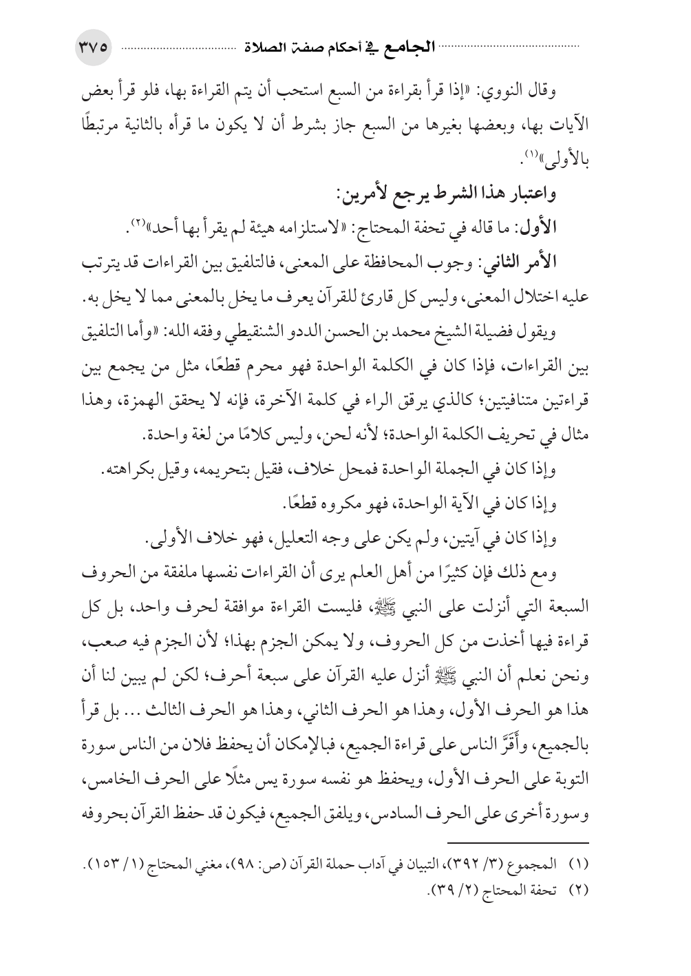 وقال النووي: «إذا قرأ بقراءة من السبع استحب أن يتم القراءة بها، فلو قرأ بعض الآيات بها، وبعضها بغيرها من السبع جاز بشرط أن لا يكون ما قرأه بالثانية مرتبطًا بالأولى» (¬١).