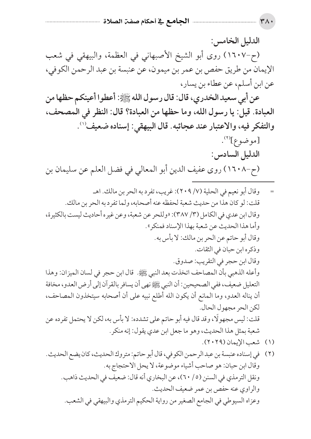وأعله الذهبي بأن المصاحف اتخذت بعد النبي - صلى الله عليه وسلم -. قال ابن حجر في لسان الميزان: وهذا التعليل ضعيف، ففي الصحيحين: أن النبي - صلى الله عليه وسلم - نهى أن يسافر بالقرآن إلى أرض العدو، مخافة أن يناله العدو، وما المانع أن يكون الله أطلع نبيه على أن أصحابه سيتخذون المصاحف، لكن الحر مجهول الحال.