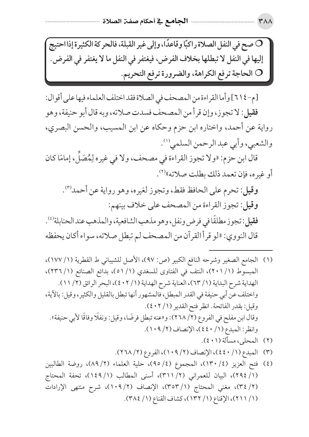 قال ابن حزم: «ولا تجوز القراءة في مصحف، ولا في غيره لِمُصَلٍّ، إمامًا كان أو غيره، فإن تعمد ذلك بطلت صلاته» (¬٢).