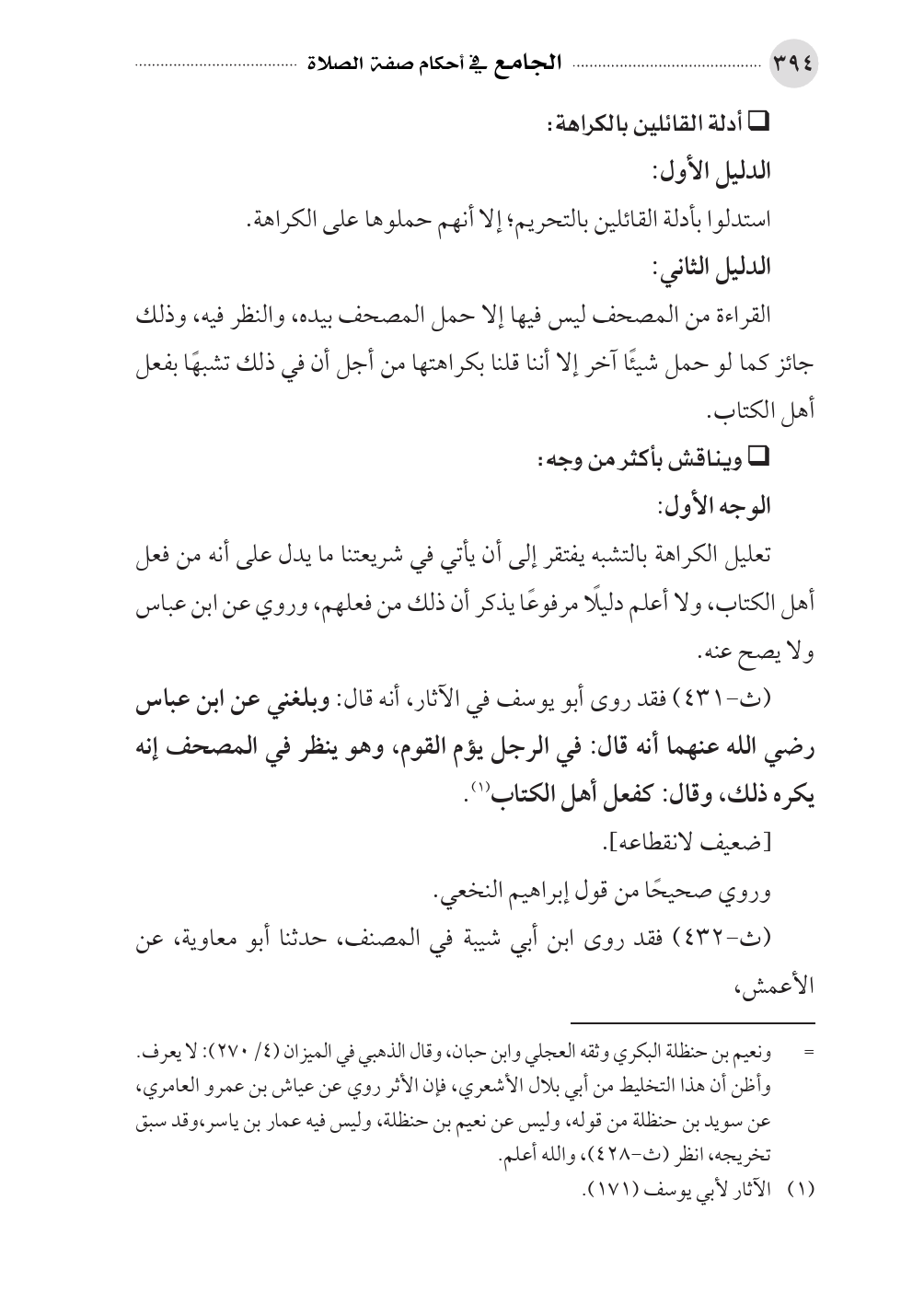 (ث-٤٣١) فقد روى أبو يوسف في الآثار، أنه قال: وبلغني عن ابن عباس رضي الله عنهما أنه قال: في الرجل يؤم القوم، وهو ينظر في المصحف إنه يكره ذلك، وقال: كفعل أهل الكتاب (¬١).