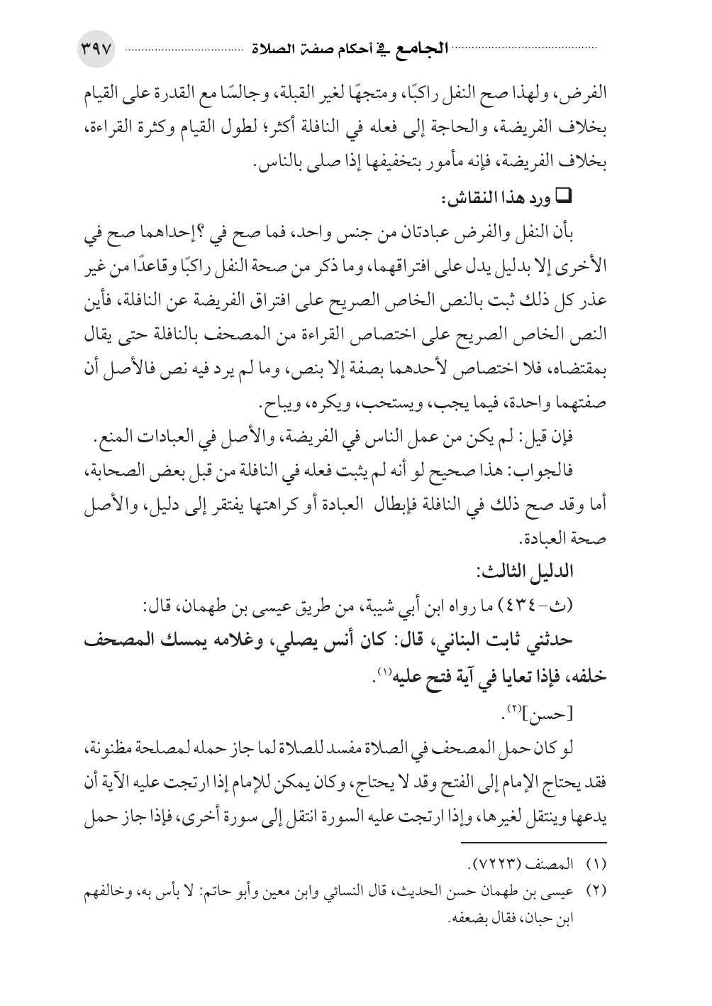 بأن النفل والفرض عبادتان من جنس واحد، فما صح في؟ إحداهما صح في الأخرى إلا بدليل يدل على افتراقهما، وما ذكر من صحة النفل راكبًا وقاعدًا من غير عذر كل ذلك ثبت بالنص الخاص الصريح على افتراق الفريضة عن النافلة، فأين النص الخاص الصريح على اختصاص القراءة من المصحف بالنافلة حتى يقال بمقتضاه، فلا اختصاص لأحدهما بصفة إلا بنص، وما لم يرد فيه نص فالأصل أن صفتهما واحدة، فيما يجب، ويستحب، ويكره، ويباح.