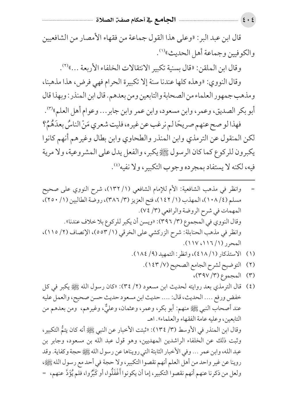 (¬٤). قال الترمذي بعد روايته لحديث ابن مسعود (٢/ ٣٤): «كان رسول الله - صلى الله عليه وسلم - يكبر في كل خفض ورفع .... الحديث، قال: .... حديث ابن مسعود حديث حسن صحيح، والعمل عليه عند أصحاب النبي - صلى الله عليه وسلم - منهم: أبو بكر، وعمر، وعثمان، وعليٌّ، وغيرهم، ومن بعدهم من التابعين، وعليه عامة الفقهاء والعلماء». اهـ