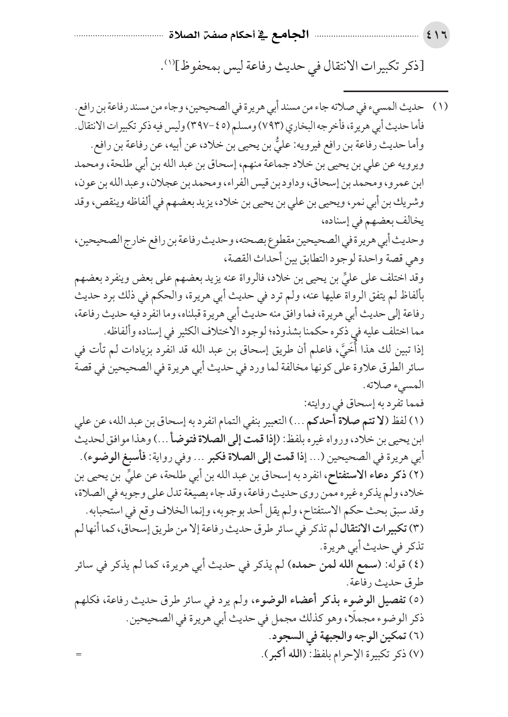 (٣) تكبيرات الانتقال لم تذكر في سائر طرق حديث رفاعة إلا من طريق إسحاق، كما أنها لم تذكر في حديث أبي هريرة.