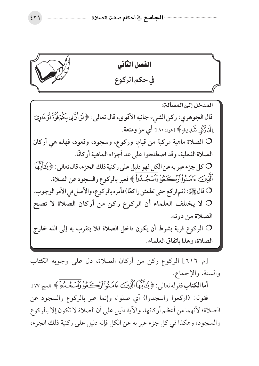 [م-٦١٦] الركوع ركن من أركان الصلاة، دل على وجوبه الكتاب والسنة، والإجماع.