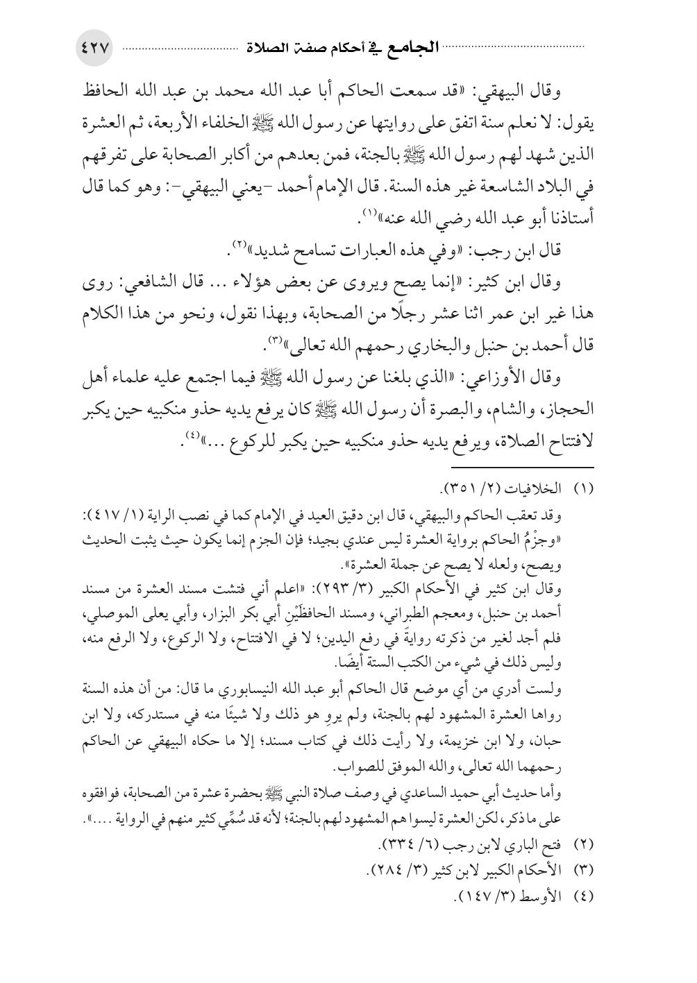 وقال ابن كثير في الأحكام الكبير (٣/ ٢٩٣): «اعلم أني فتشت مسند العشرة من مسند أحمد بن حنبل، ومعجم الطبراني، ومسند الحافظَيْنِ أبي بكر البزار، وأبي يعلى الموصلي، فلم أجد لغير من ذكرته روايةً في رفع اليدين؛ لا في الافتتاح، ولا الركوع، ولا الرفع منه، وليس ذلك في شيء من الكتب الستة أيضًا.
