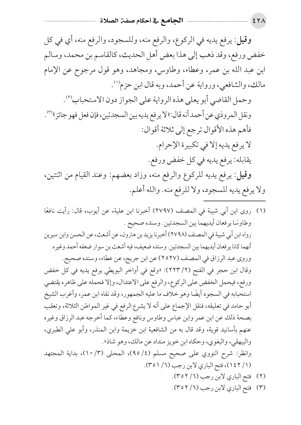 وقال ابن حجر في الفتح (٢/ ٢٢٣): «وقع في أواخر البويطي يرفع يديه في كل خفض ورفع، فيحمل الخفض على الركوع، والرفع على الاعتدال، وإلا فحمله على ظاهره يقتضي استحبابه في السجود أيضًا وهو خلاف ما عليه الجمهور، وقد نفاه ابن عمر، وأغرب الشيخ أبو حامد في تعليقه، فنقل الإجماع على أنه لا يشرع الرفع في غير المواطن الثلاثة، وتعقب بصحة ذلك عن ابن عمر وابن عباس وطاوس ونافع وعطاء، كما أخرجه عبد الرزاق وغيره عنهم بأسانيد قوية، وقد قال به من الشافعية ابن خزيمة وابن المنذر، وأبو علي الطبري، والبيهقي، والبغوي، وحكاه ابن خويز منداد عن مالك، وهو شاذ».