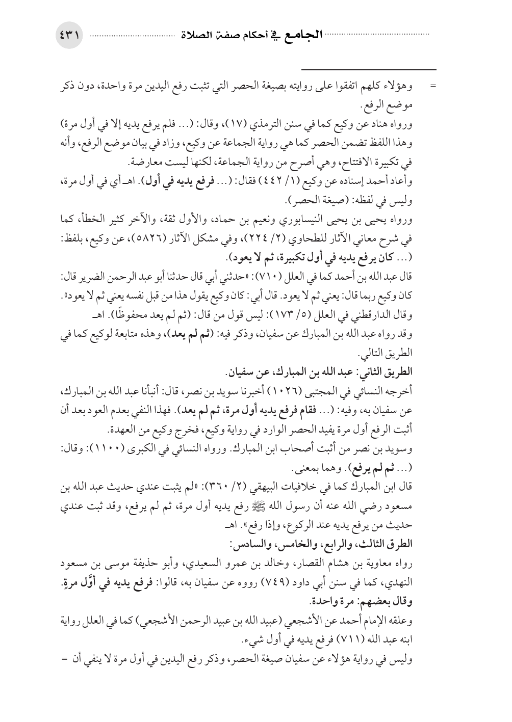وأعاد أحمد إسناده عن وكيع (١/ ٤٤٢) فقال: ( ... فرفع يديه في أول). اهـ أي في أول مرة، وليس في لفظه: (صيغة الحصر).