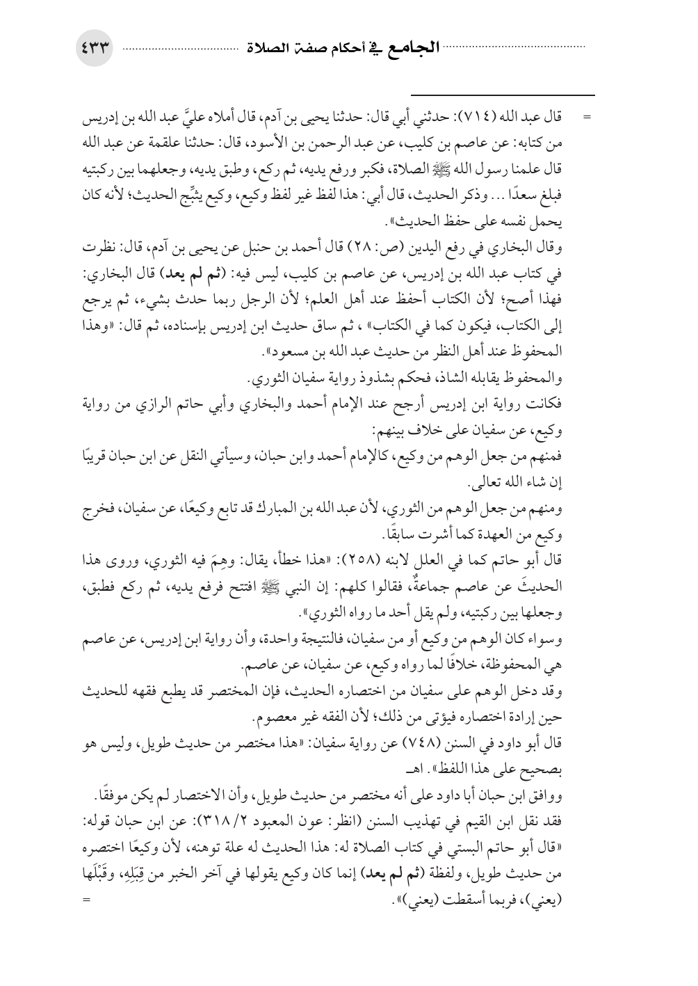 وقال البخاري في رفع اليدين (ص: ٢٨) قال أحمد بن حنبل عن يحيى بن آدم، قال: نظرت في كتاب عبد الله بن إدريس، عن عاصم بن كليب، ليس فيه: (ثم لم يعد) قال البخاري: فهذا أصح؛ لأن الكتاب أحفظ عند أهل العلم؛ لأن الرجل ربما حدث بشيء، ثم يرجع إلى الكتاب، فيكون كما في الكتاب»، ثم ساق حديث ابن إدريس بإسناده، ثم قال: «وهذا المحفوظ عند أهل النظر من حديث عبد الله بن مسعود».