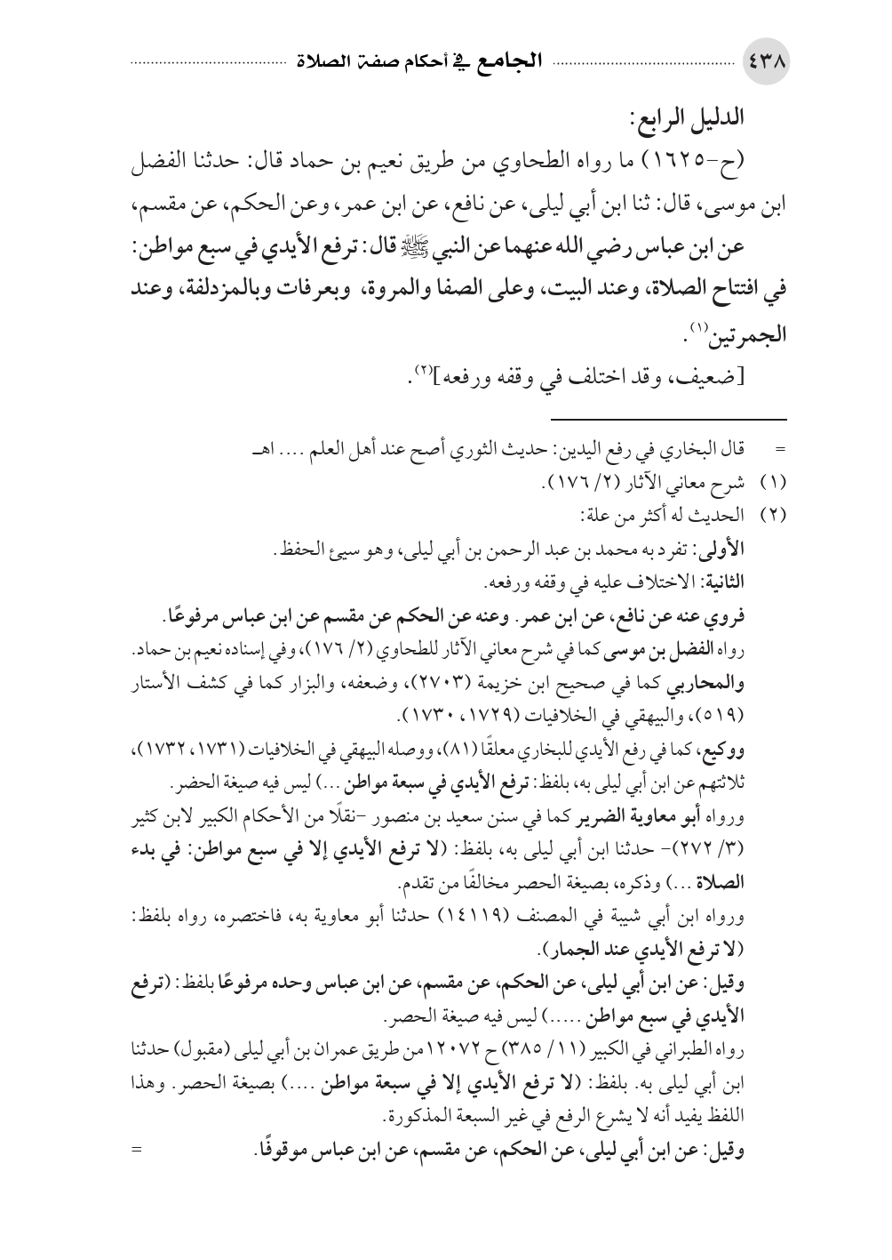 (ح-١٦٢٥) ما رواه الطحاوي من طريق نعيم بن حماد قال: حدثنا الفضل ابن موسى، قال: ثنا ابن أبي ليلى، عن نافع، عن ابن عمر، وعن الحكم، عن مقسم،