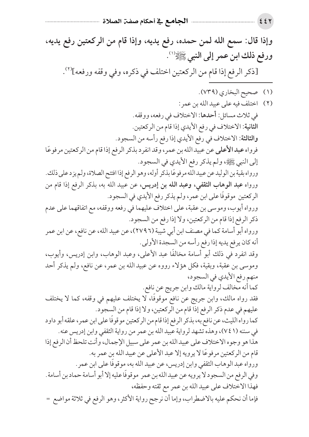 هذا هو وجوه الاختلاف على عبيد الله بن عمر على سبيل الإجمال، وأنت تلحظ أن الرفع إذا قام من الركعتين مرفوعًا لا يرويه إلا عبد الأعلى عن عبيد الله بن عمر به.