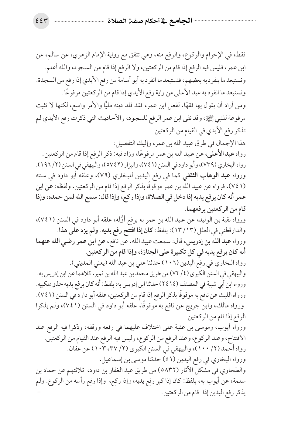 ورواه عبد الوهاب الثقفي كما في رفع اليدين للبخاري (٧٩)، وعلقه أبو داود في سننه (٧٤١)، فرواه عن عبيد الله بن عمر موقوفًا بذكر الرفع إذا قام من الركعتين، ولفظه: عن ابن عمر أنه كان يرفع يديه إذا دخل في الصلاة، وإذا ركع، وإذا قال: سمع الله لمن حمده، وإذا قام من الركعتين يرفعهما.