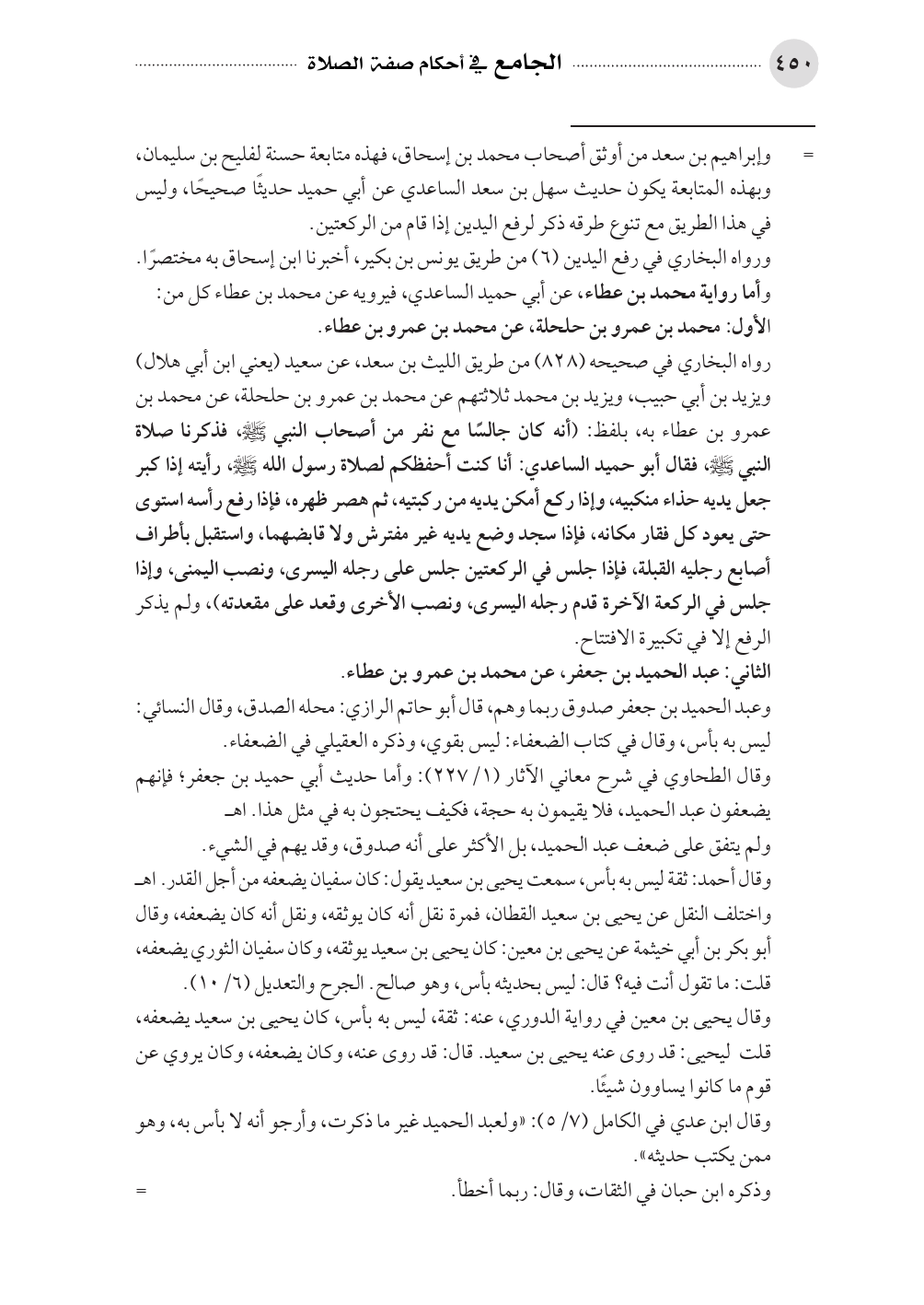 = وإبراهيم بن سعد من أوثق أصحاب محمد بن إسحاق، فهذه متابعة حسنة لفليح بن سليمان، وبهذه المتابعة يكون حديث سهل بن سعد الساعدي عن أبي حميد حديثًا صحيحًا، وليس في هذا الطريق مع تنوع طرقه ذكر لرفع اليدين إذا قام من الركعتين.