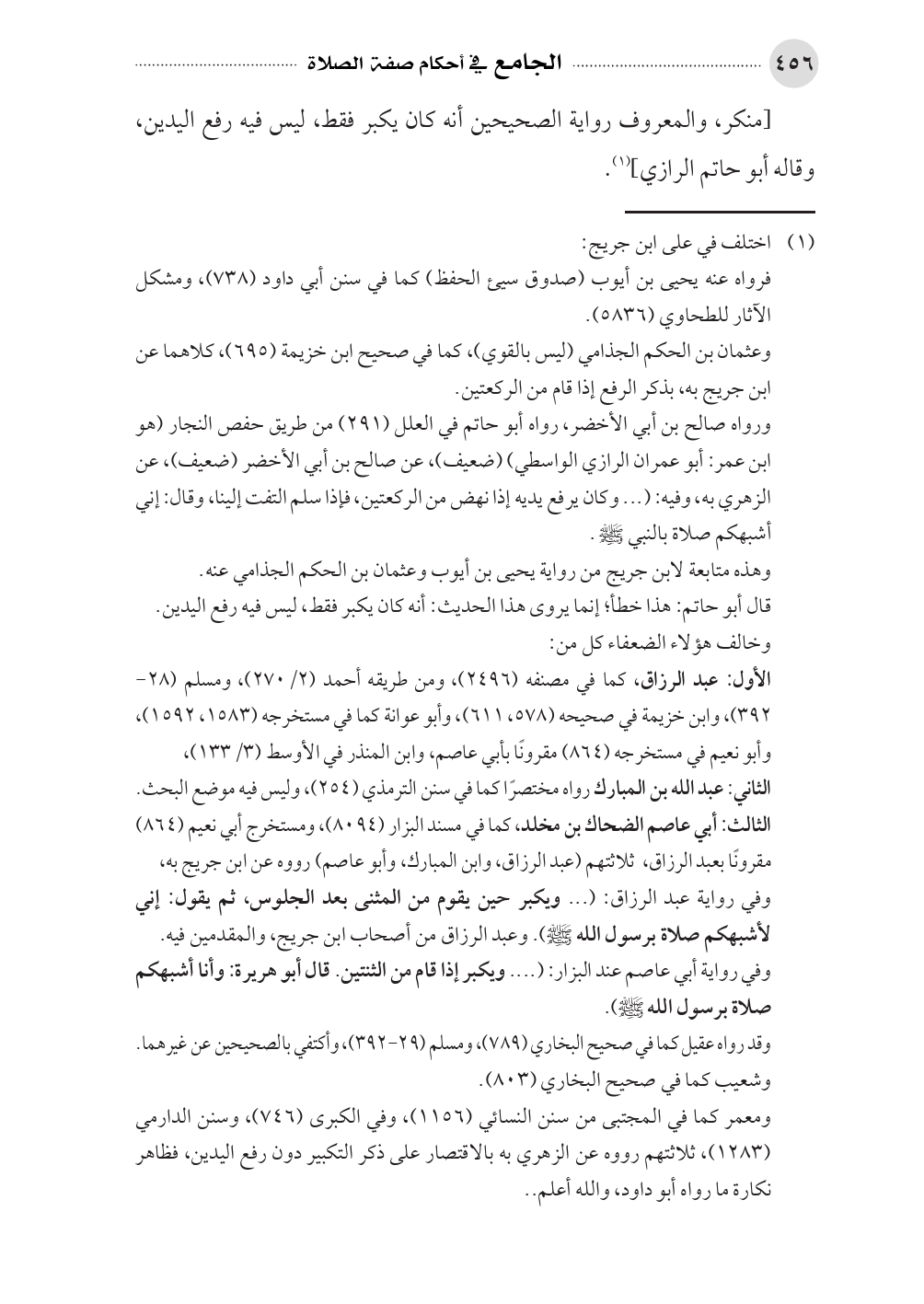 وفي رواية عبد الرزاق: ( ... ويكبر حين يقوم من المثنى بعد الجلوس، ثم يقول: إني لأشبهكم صلاة برسول الله - صلى الله عليه وسلم -). وعبد الرزاق من أصحاب ابن جريج، والمقدمين فيه.