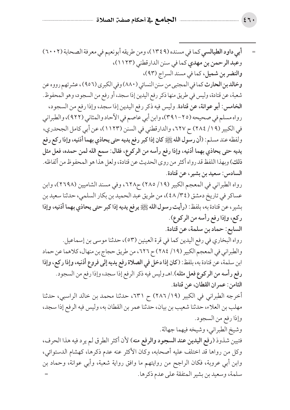 فتبين شذوذ (رفع اليدين عند السجود والرفع منه) لأن أكثر الطرق لم يرد فيه هذا الحرف، وكل من رواها قد اختلف عليه أصحابه، وكان الأكثر عنه عدم ذكرها، كهشام الدستوائي، وابن أبي عروبة، فكان الراجح من روايتهم ما وافق رواية شعبة، وأبي عوانة، وحماد بن سلمة، وسعيد بن بشير المتفقة على عدم ذكرها.
